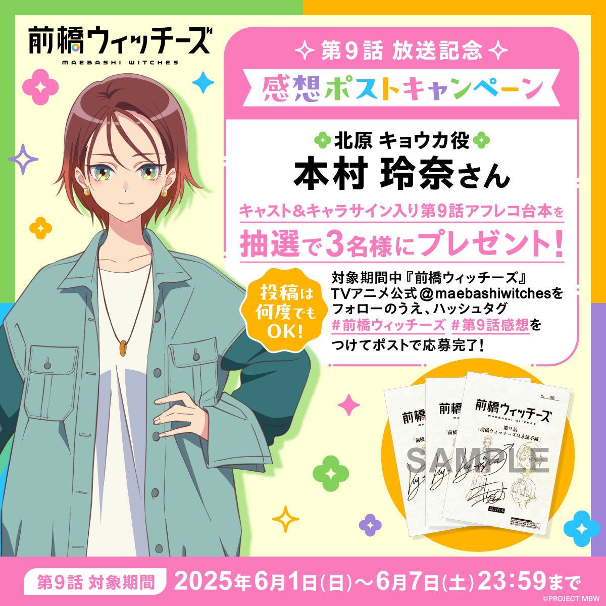 オリジナルアニメ『前橋ウィッチーズ』の放送を記念して、北原 キョウカ役 本村 玲奈さんのキャスト&キャラサイン入り第9話台本を、3名様にプレゼントいたします