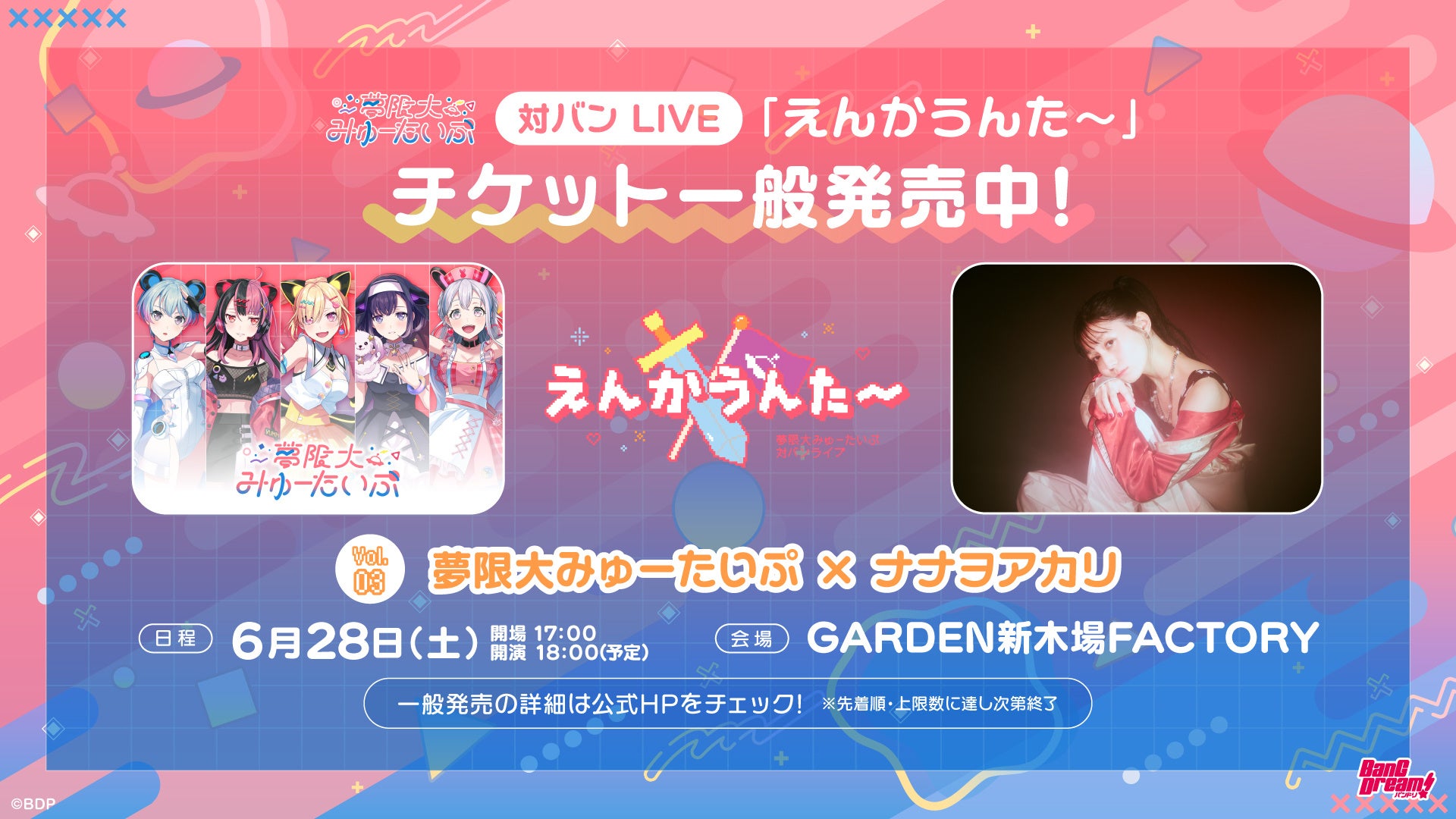 6月28日(土)にGARDEN新木場FACTORYにて開催する、夢限大みゅーたいぷ 対バンライブ「えんかうんた~」Vol.3のチケットが現在好評発売中です。