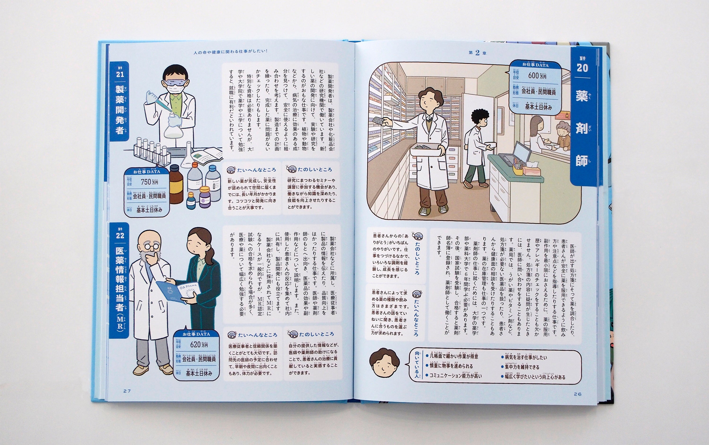 書籍の装画や広告など、第一線で活躍するこのイラストレーター3名により、400点以上のイラストが本シリーズのために描きおろされおり、見応えのある職業図鑑となっています。