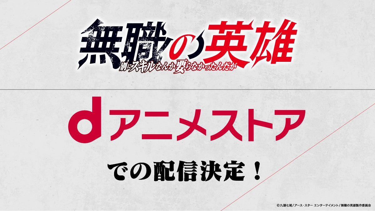 株式会社ブシロード(本社:東京都中野区、代表取締役社長:木谷高明)のグループ会社にあたる株式会社ブシロードムーブ(本社:東京都中野区、代表取締役社長:朝倉成巳)は、 株式会社アース・スター エンターテイメント(本社:東京都品川区、代表取締役社長:幕内和博)が刊行しているノベル作品「無職の英雄 ~別にスキルなんか要らなかったんだが~」(アース・スター エンターテイメント刊)のTVアニメの放送時期とdアニメストアでの配信が決定したことをご案内致します。
