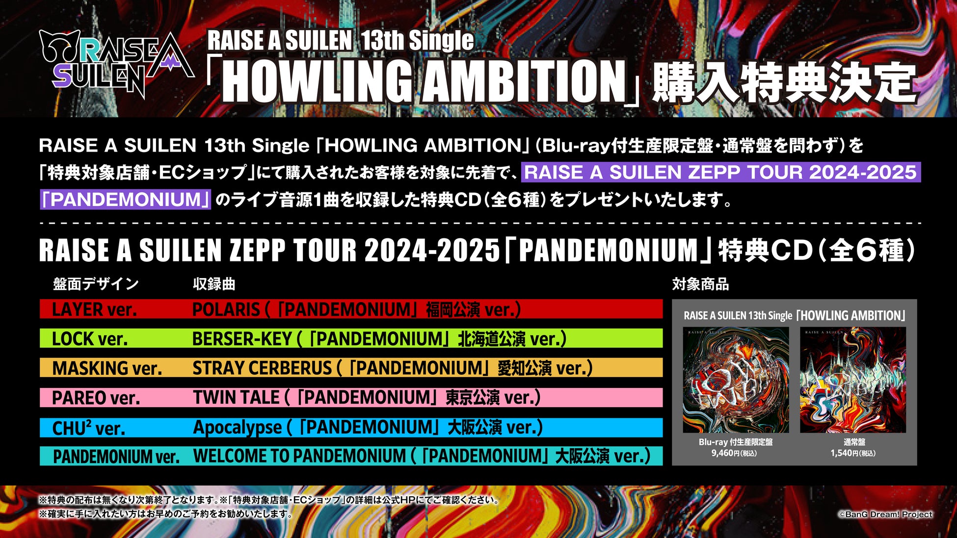 「特典対象店舗・ECショップ」にて購入されたお客様を対象に先着で、RAISE A SUILEN ZEPP TOUR 2024-2025「PANDEMONIUM」のライブ音源1曲を収録した「特典CD」1枚(全6種)をプレゼントいたします。