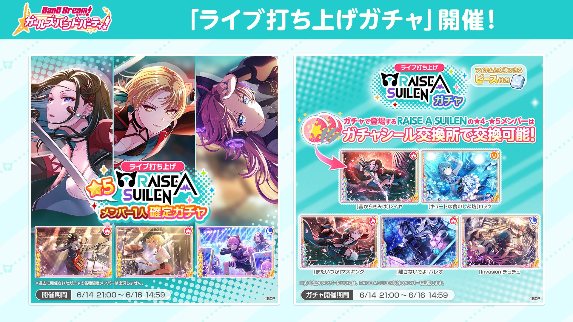 本ライブ開催を記念して、「ライブ打ち上げガチャ」が開催中です。RAISE A SUILENメンバーの出現率がアップするほか、様々なアイテムと交換できるピース付きとなります。