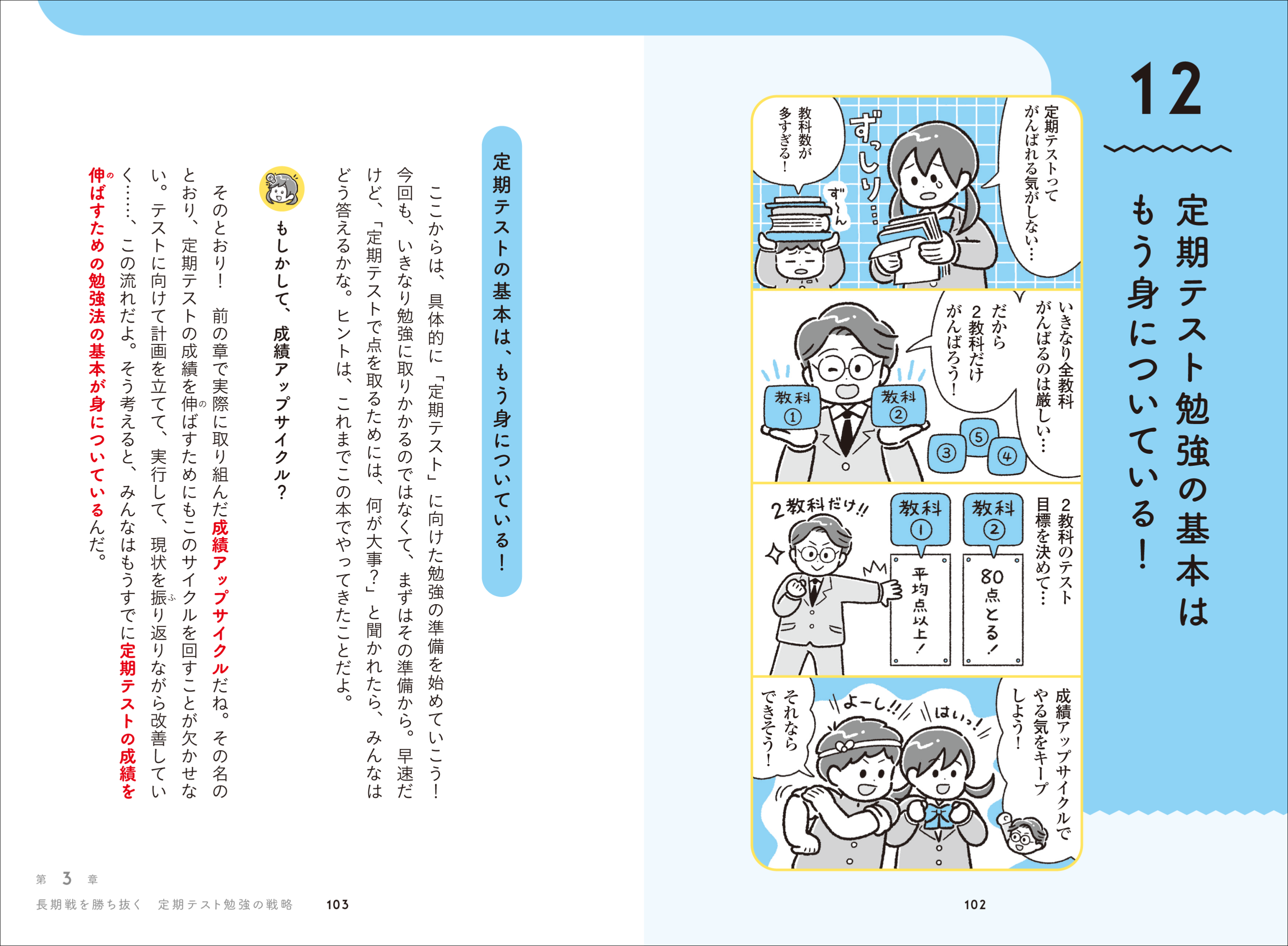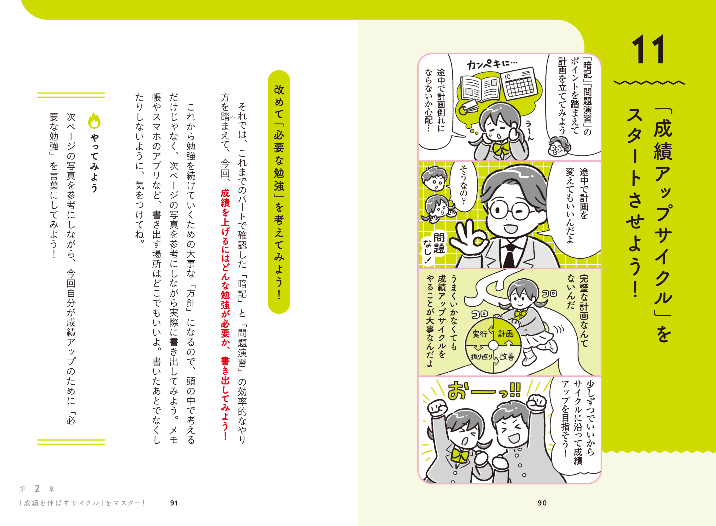 「勉強への素直な気持ちを言葉にしよう!」「成績アップサイクルをスタートさせよう!」など、各テーマの冒頭には4コママンガがついており、中学生本人がそのテーマの概要を理解したうえで読み進められます。著者のやさしい語り口調やスモールステップで進む構成もあり、やる気の有無にかかわらず読みやすい内容です