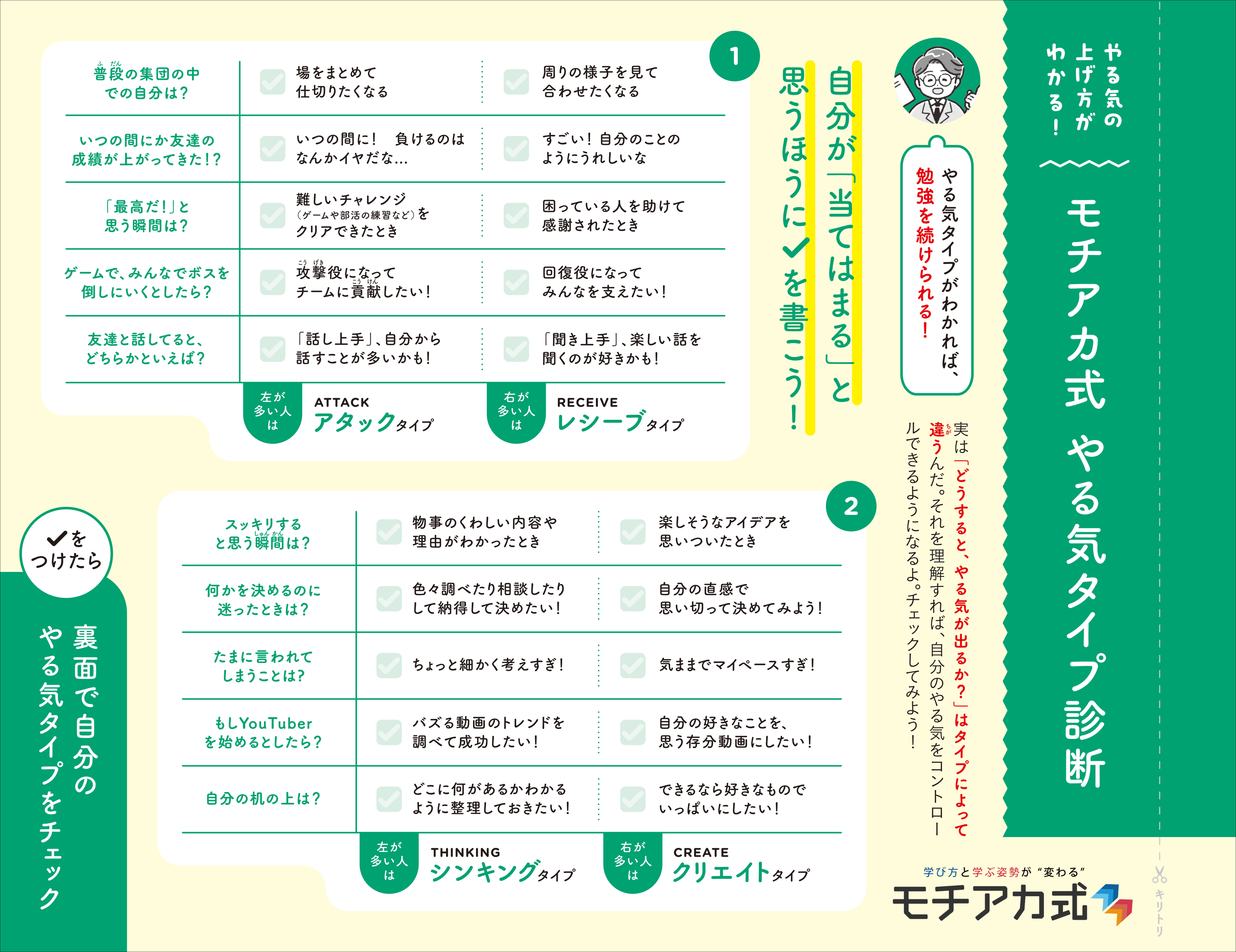 巻頭にある「やる気タイプ診断」を利用すれば、自分のやる気タイプが簡単にわかります。タイプ別に自分に最適なやる気の上げ方やぴったりの勉強法を見つけやすいのも特長のひとつです。