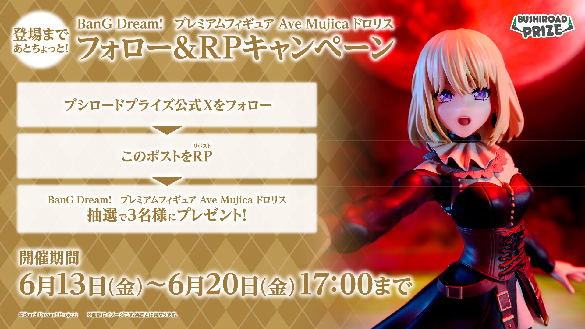 株式会社ブシロード(本社:東京都中野区、代表取締役社長:木谷高明)のグループ会社にあたる株式会社ブシロードクリエイティブ(本社:東京都中野区、代表取締役社⻑:成⽥耕祐)は、「BanG Dream! プレミアムフィギュア Ave Mujica ドロリス」を2025年6月20日(金)から全国のゲームセンターに順次展開いたします。