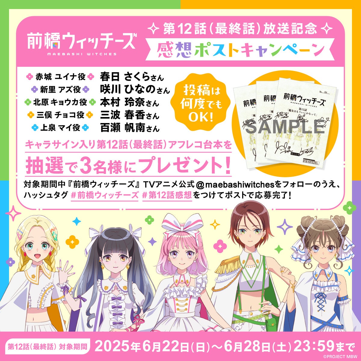 オリジナルアニメ『前橋ウィッチーズ』の放送を記念して、赤城ユイナ役 春日さくらさん、新里アズ役 咲川ひなのさん、北原キョウカ役 本村玲奈さん、三俣チョコ役 三波春香さん、上泉マイ役 百瀬帆南さんのキャラサイン入り最終話台本を、3名様にプレゼントいたします。