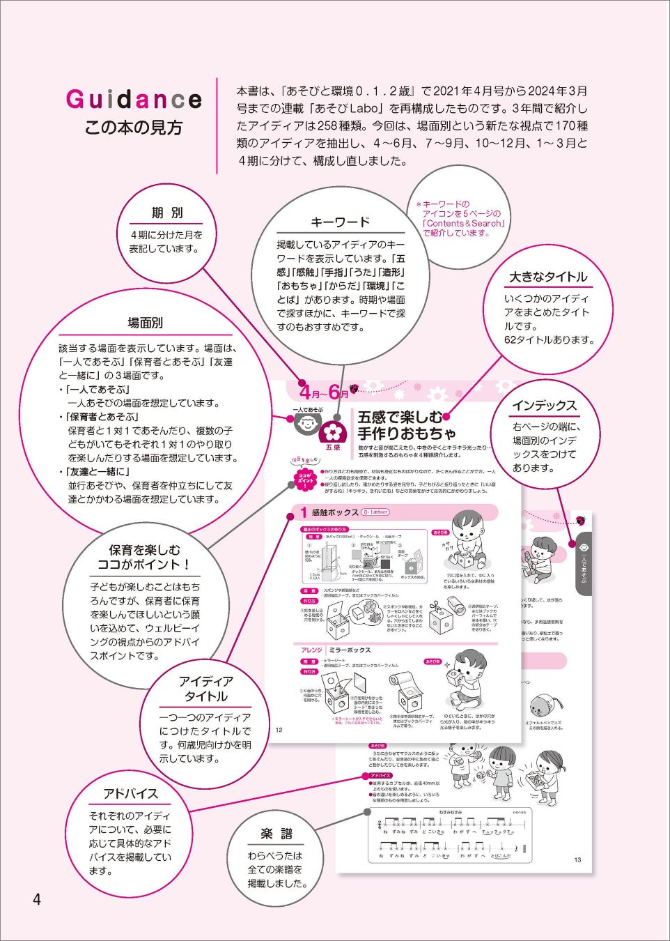 成長著しい0.1.2歳児向けに「一人であそぶ」「保育者とあそぶ」「友達と一緒に」といった、実際の保育現場で想定される3つの「場面」から、今必要なあそびをすぐに選ぶことができます。さらに、4月から翌年3月まで、子どもの発達・興味・関心の流れに沿って構成されているため、子どもの成長段階に合わせた最適なアプローチが可能です。