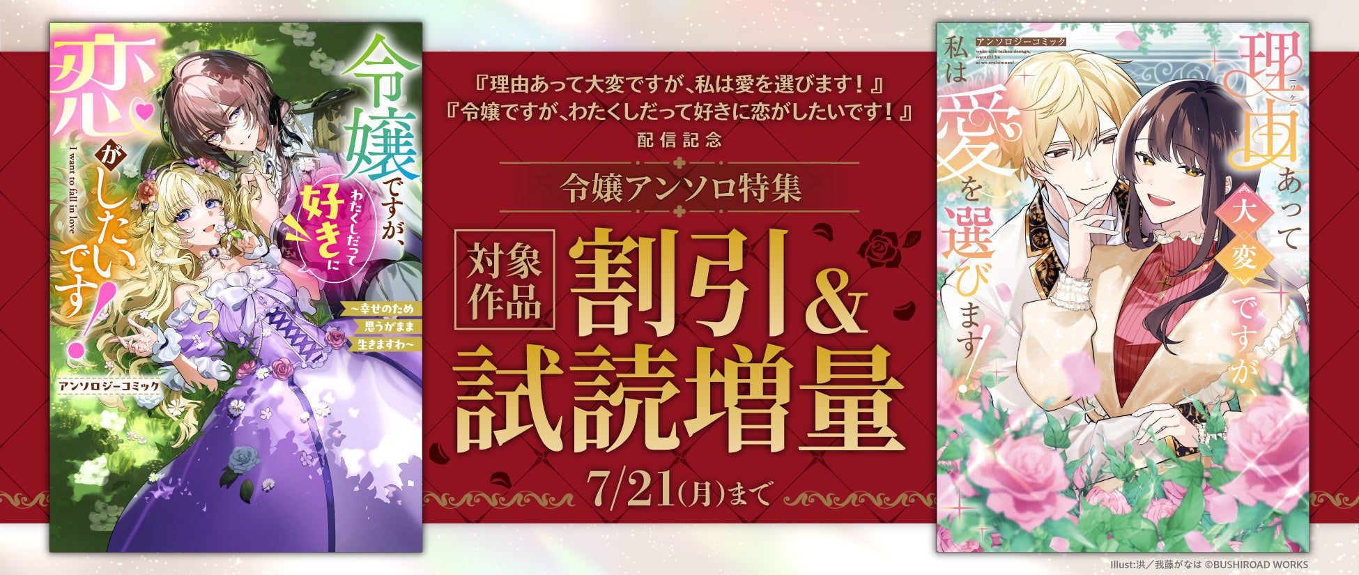 株式会社ブシロード(本社:東京都中野区、代表取締役社⻑:木谷高明)のグループ会社にあたる株式会社ブシロードワークス(本社:東京都中野区、代表取締役社長:新福恭平)は、「小説家になろう」より読切作品をコミカライズした令嬢たちのアンソロジー2冊が本日7月8日(火)より発売することをご案内致します。また、発売を記念した電子書籍フェアも実施中です。