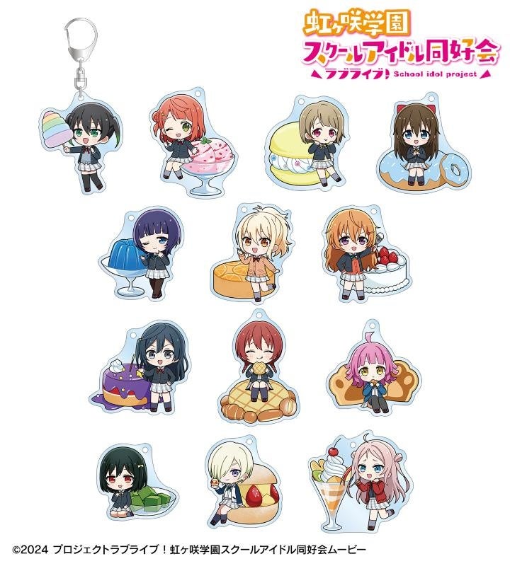 高咲 侑、上原歩夢、中須かすみ、桜坂しずく、朝香果林、宮下 愛、近江彼方、優木せつ菜、エマ・ヴェルデ、天王寺璃奈、三船栞子、ミア・テイラー、鐘 嵐珠のちびキャライラストをメインにデザインし、アクリルキーホルダーに仕上げました。