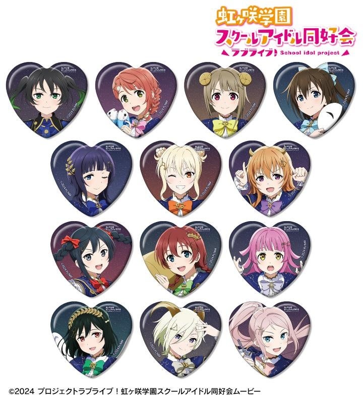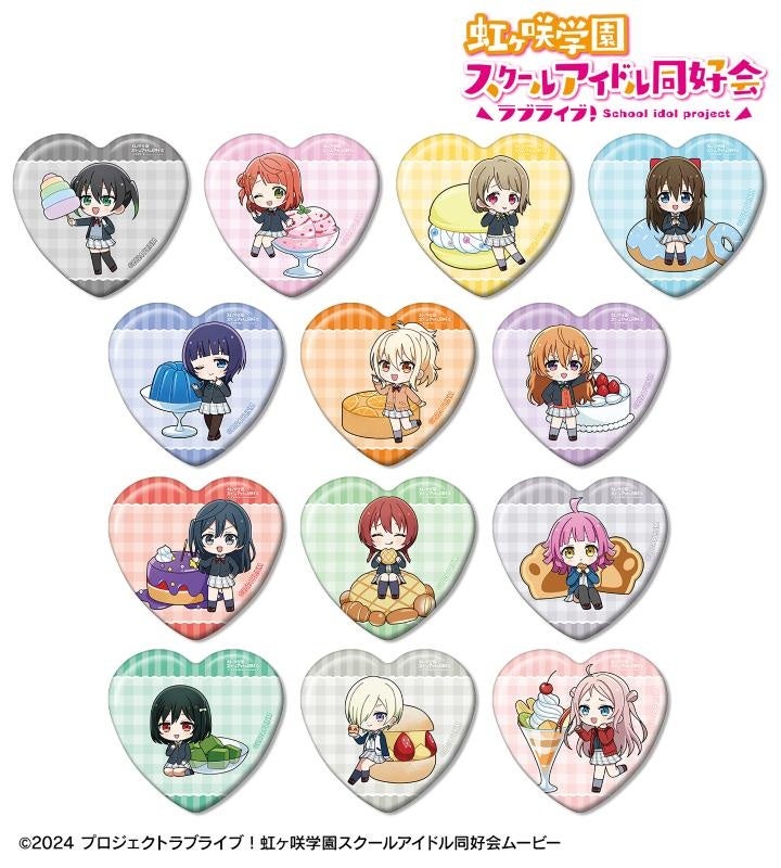 高咲 侑、上原歩夢、中須かすみ、桜坂しずく、朝香果林、宮下 愛、近江彼方、優木せつ菜、エマ・ヴェルデ、天王寺璃奈、三船栞子、ミア・テイラー、鐘 嵐珠のちびキャライラストをメインにデザインし、ハート型の缶バッジに仕上げました。