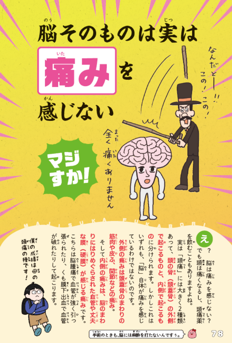 本書では、「からだ」「脳」「病気」「医療」「歴史上行われてきた人体に関する実験」など、からだにまつわる、さまざまなジャンルの知識が満載です。