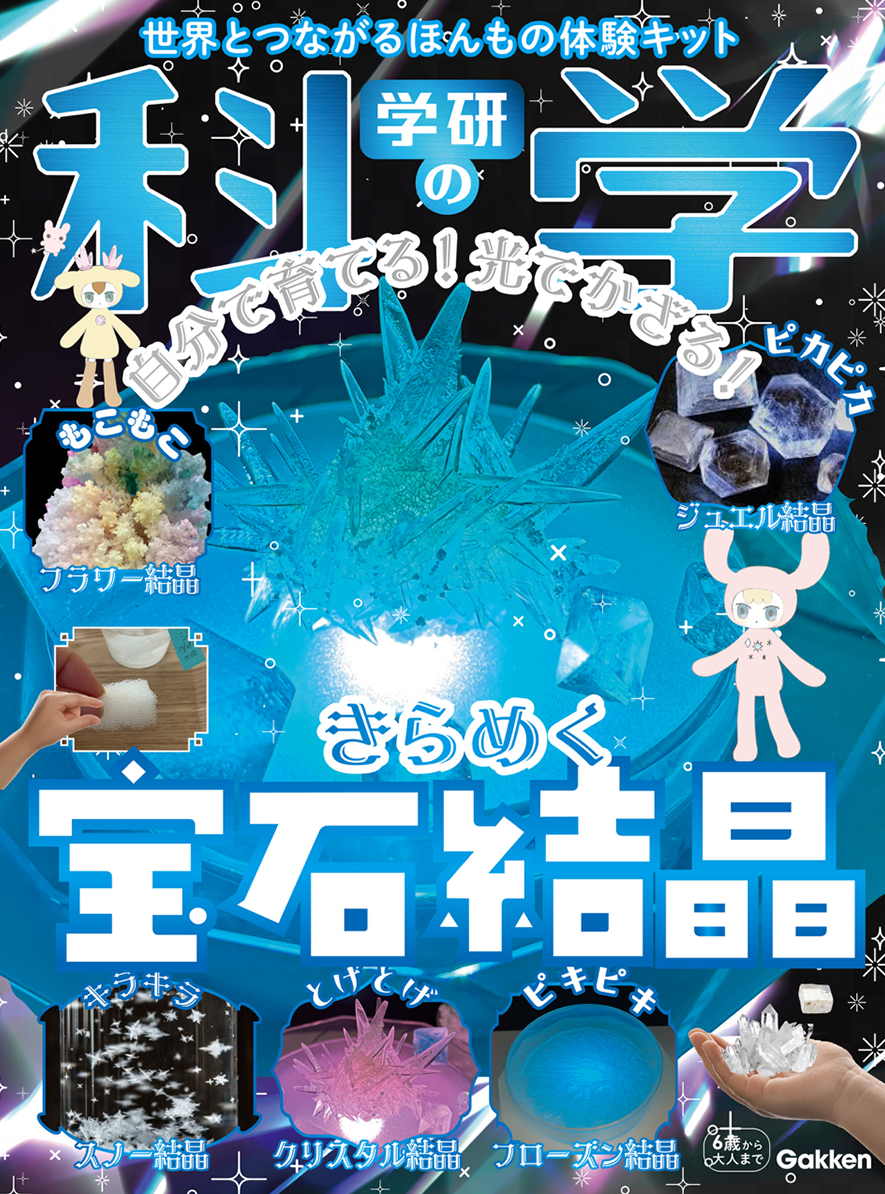 『学研の科学』は、体験キットの「きらめく宝石結晶」、さまざまな結晶の不思議を紹介している本誌、別冊の学研まんが「ひみつシリーズ」、実験の投稿やオンラインワークショップに参加できるオンラインコミュニティ「あそぶんだ研究所」がセットになって、ほんものの科学体験をお届けします。