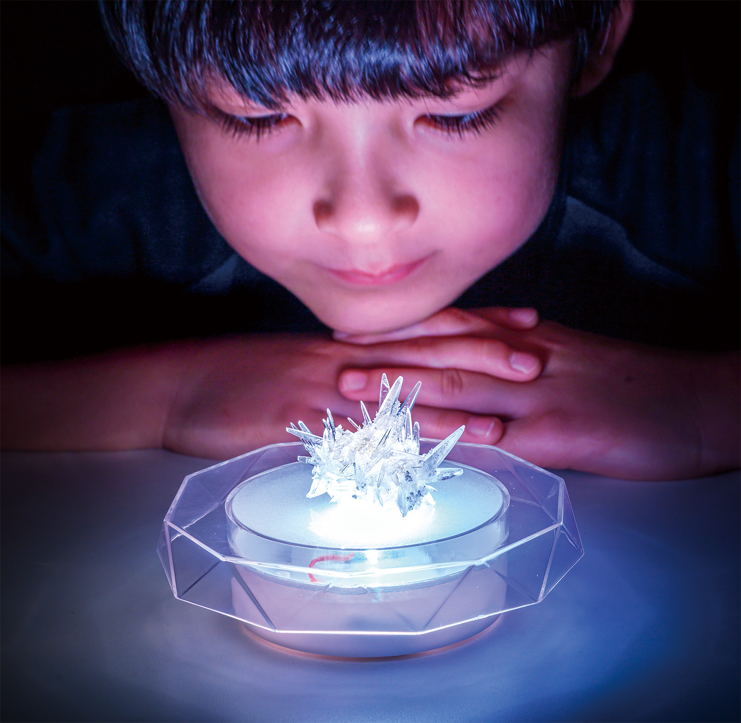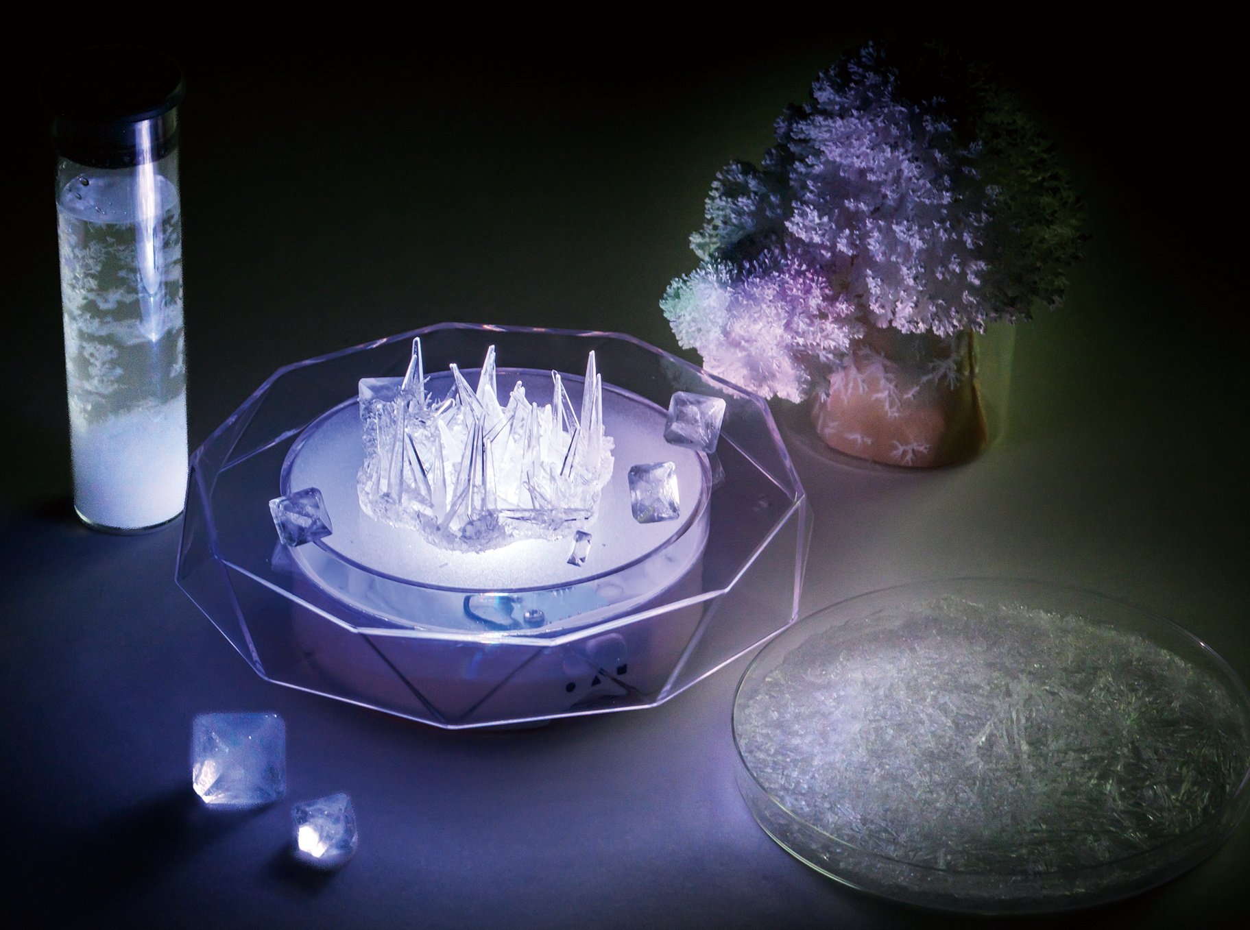 『学研の科学』で初めての化学実験教材。5種類の薬品と実験器具つきで、それぞれちがう形の結晶が育てられます。結晶の育つ期間はいろいろ。結晶を虹色にライトアップするLED台座もついています。