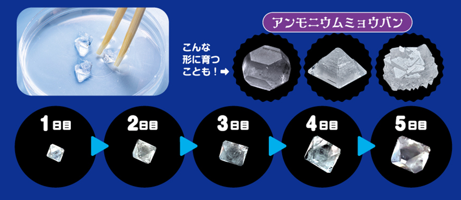 「結晶のもと」が5種類もついていて、それぞれちがう形の結晶が育てられます。育つ期間はいろいろ。すぐできる結晶や、2~3日で育つ結晶、1~2週間楽しく育てる結晶もあります。