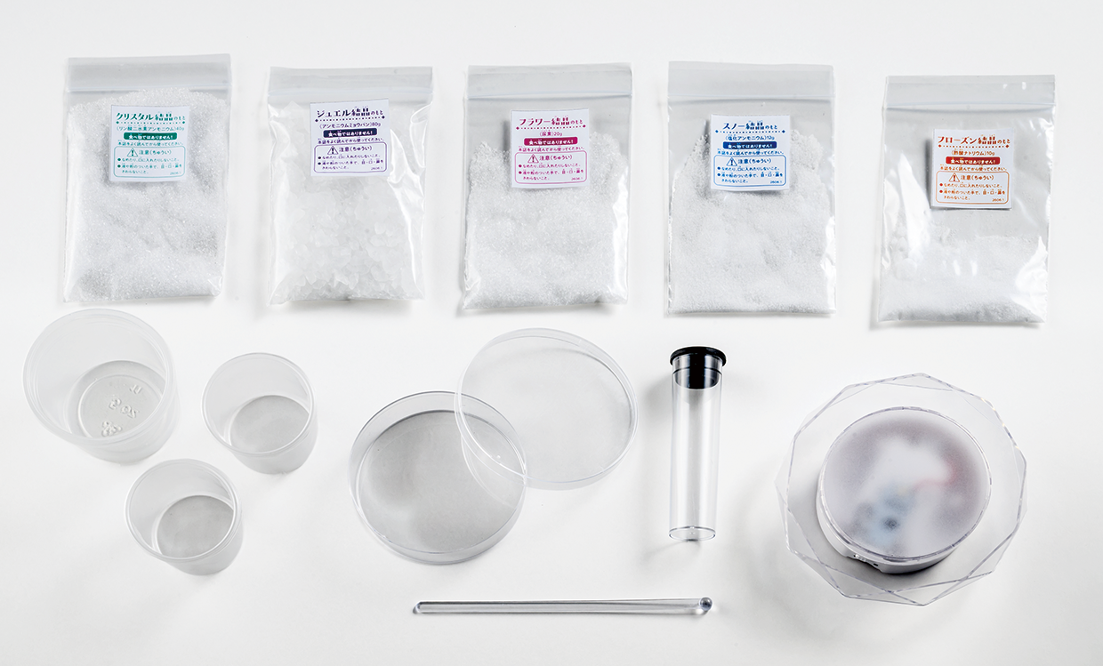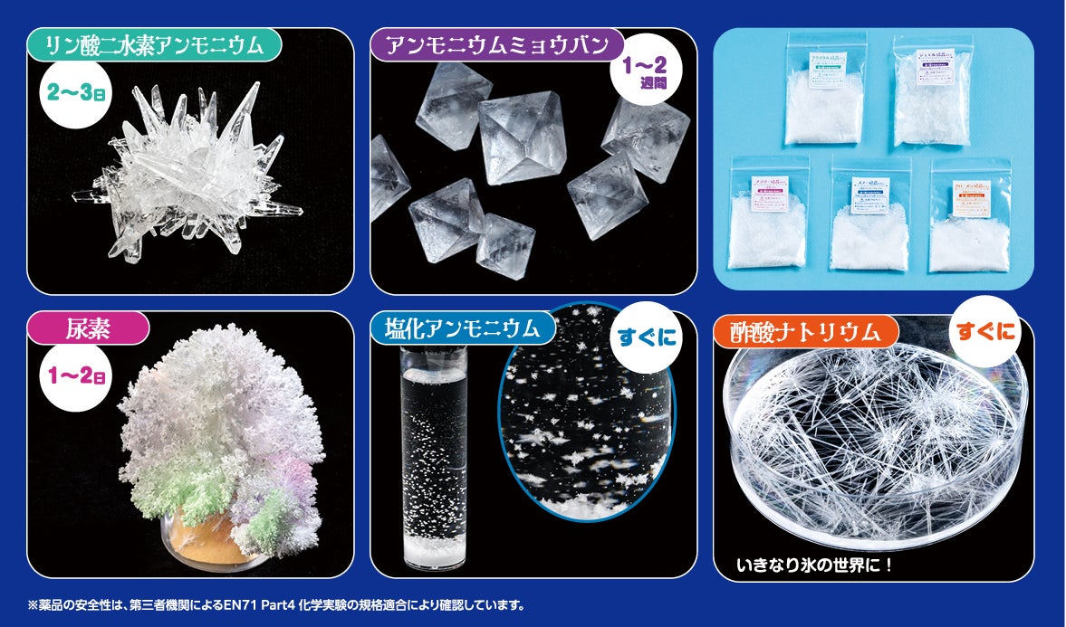 ●クリスタル結晶(リン酸二水素アンモニウム) ●ジュエル結晶(アンモニウムミョウバン) ●フラワー結晶(尿素) ●スノー結晶(塩化アンモニウム) ●フローズン結晶(酢酸ナトリウム)