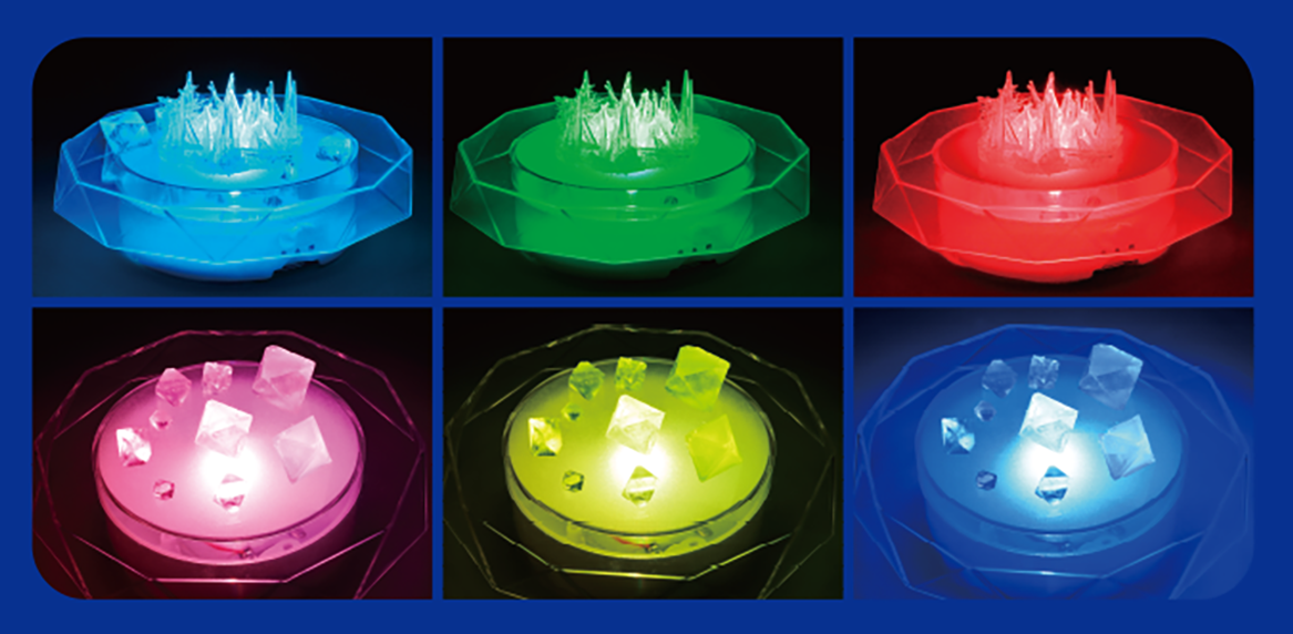結晶を美しくライトアップするイルミネーションステージ(LED台座)がついています。成長する過程や完成した結晶を置いて、じっくり観察できます。育てた結晶が虹色に変化してキレイ!