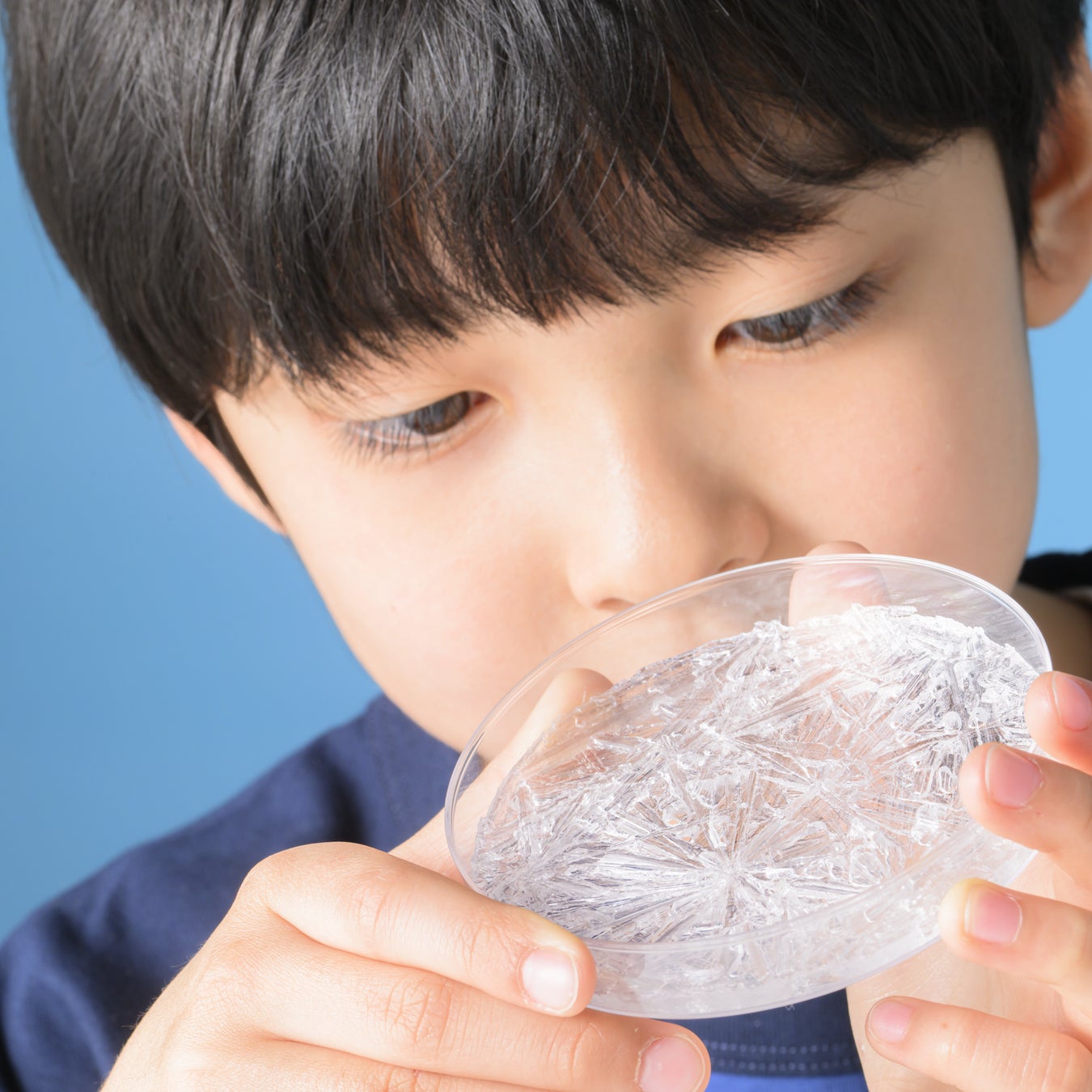 おうちで本格的な化学実験ができる教材です。試験管やシャーレなどの実験器具や「結晶のもと」がついていて、結晶を育成する実験ができます。