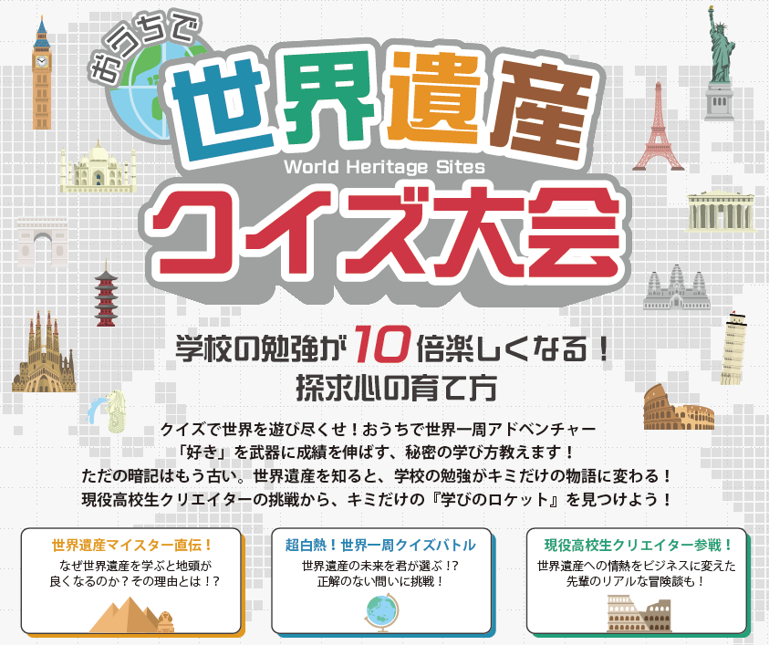 新小4生~新中3生対象のオンラインイベント、「おうちで世界遺産クイズ大会」3月28日開催!