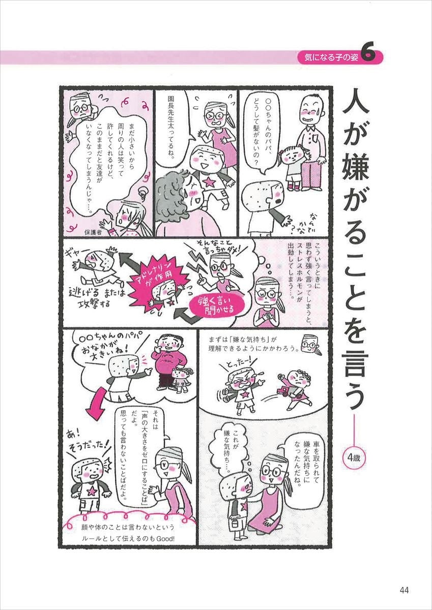 「人が嫌がることを言う」「話しかけても反応しない」「自分のものではないものを持ってきてしまう」「相手の気持ちの理解が苦手」「『例外』を受け入れにくい」など、対応に悩みやすい「気になる子」の15の具体例をマンガでわかりやすく解説。「なるほど!解説」として「セルフエスティーム」「他者視点の理解」「子どものアンガーマネジメント」などの専門知識も、専門家の視点で、ていねいに深掘りしました。