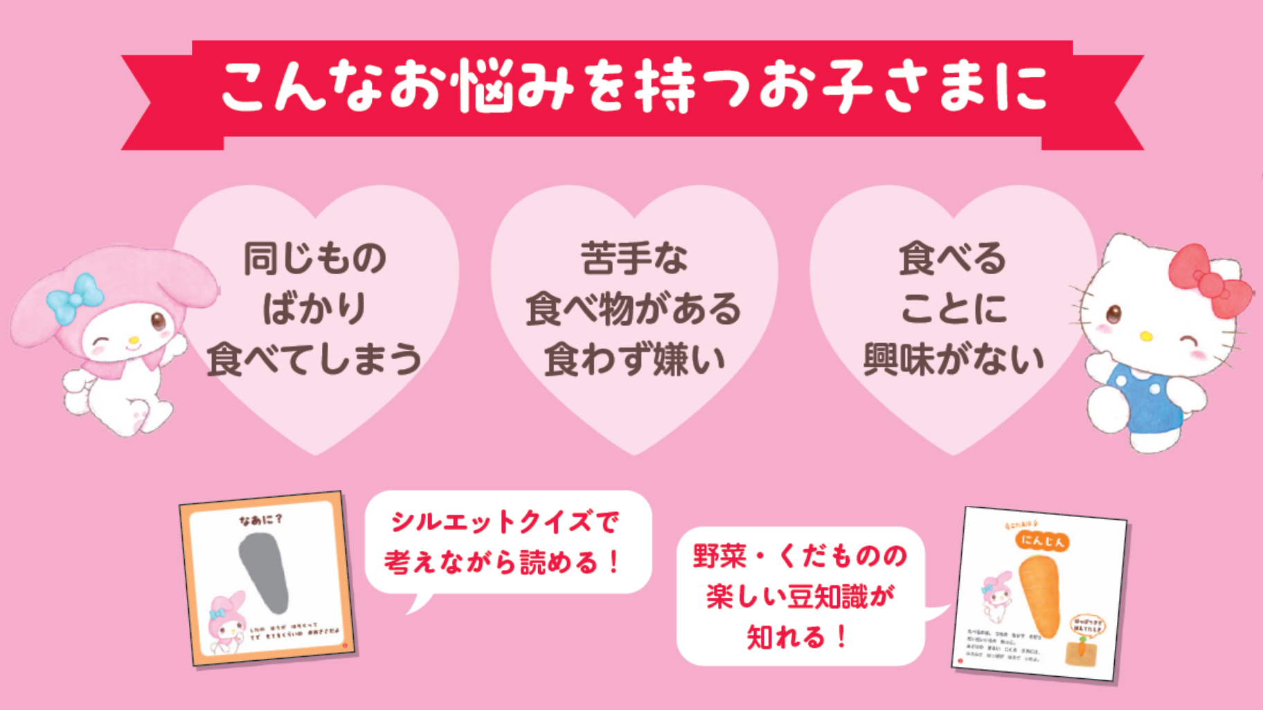 サンリオキャラクターズと一緒に、野菜のシルエットクイズに挑戦したり、果物の豆知識を学んだりして、食べ物について知ることができます。ただ読むだけでなく、クイズという体験を通して学べるのがポイントです。