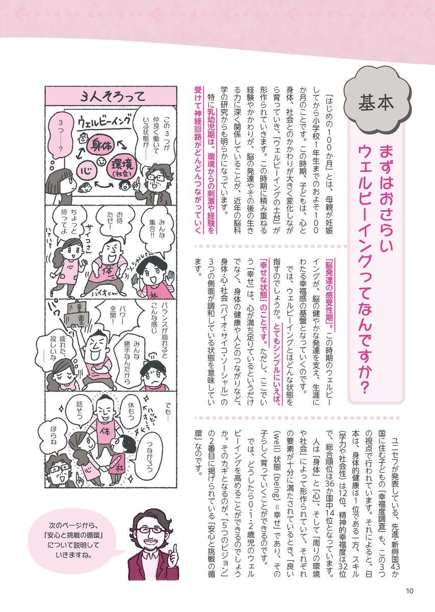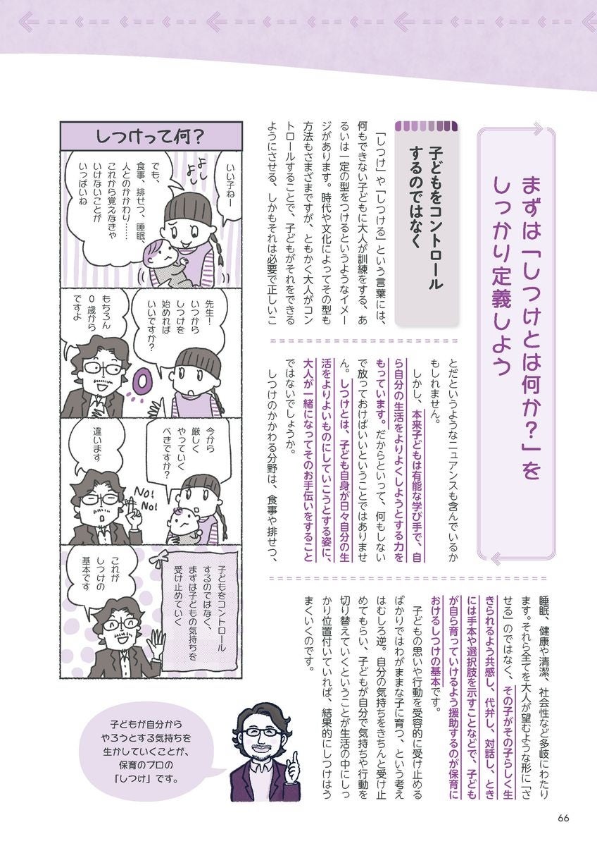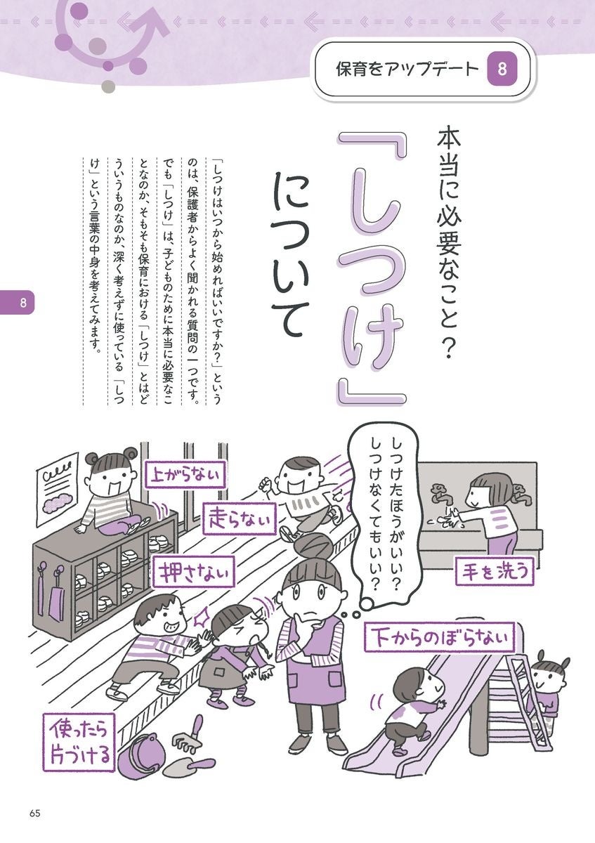 本書は、幼児教育のスペシャリストである大豆生田先生が、変わりゆく0・1・2歳児保育と保育者ができることについて、11のテーマ別にわかりやすく解説。「はじめの100か月の育ちビジョンから何を読み取る?」「しつけとは? かつてと今はどう違うの?」「0・1・2歳児の主体的保育、カンチガイしてない?」など、マンガや園の実例などを交えながら、やさしくレクチャーします。