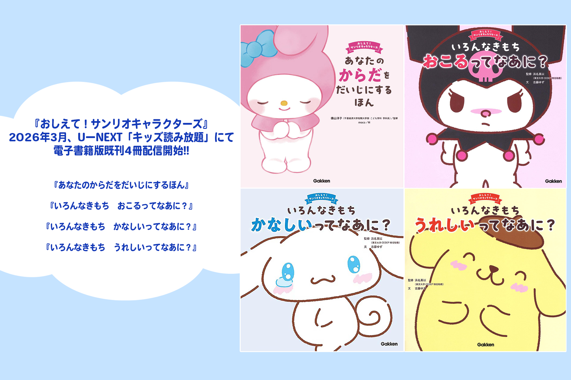 株式会社 学研ホールディングス(東京・品川/代表取締役社長:宮原博昭)のグループ会社、株式会社 Gakken(東京・品川/代表取締役社長:南條達也)は、2026年3月25日(水)に『おしえて!サンリオキャラクターズ』シリーズ既刊4冊を、U-NEXT「キッズ読み放題」にて配信開始いたしました。U-NEXTの月額プラン会員であれば、追加料金なくお楽しみいただけます。