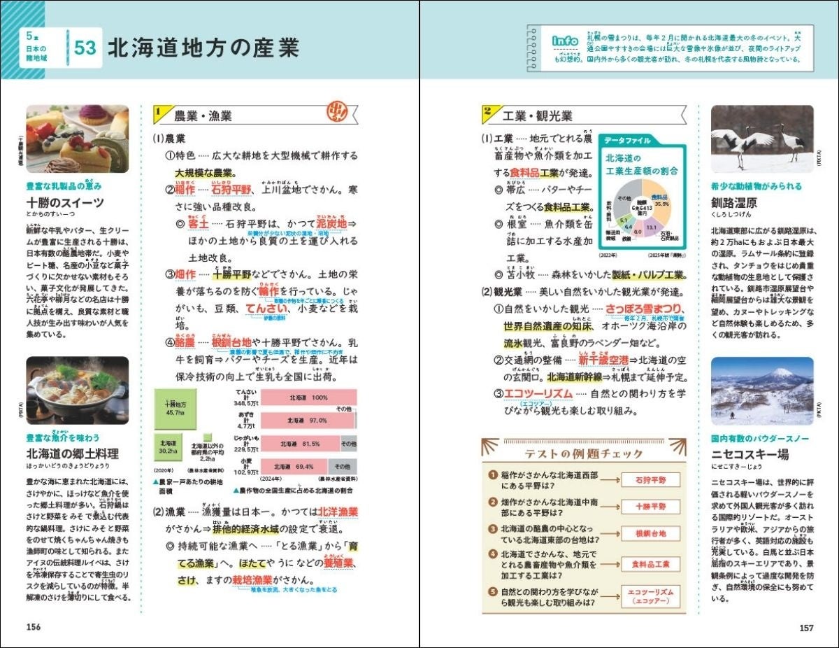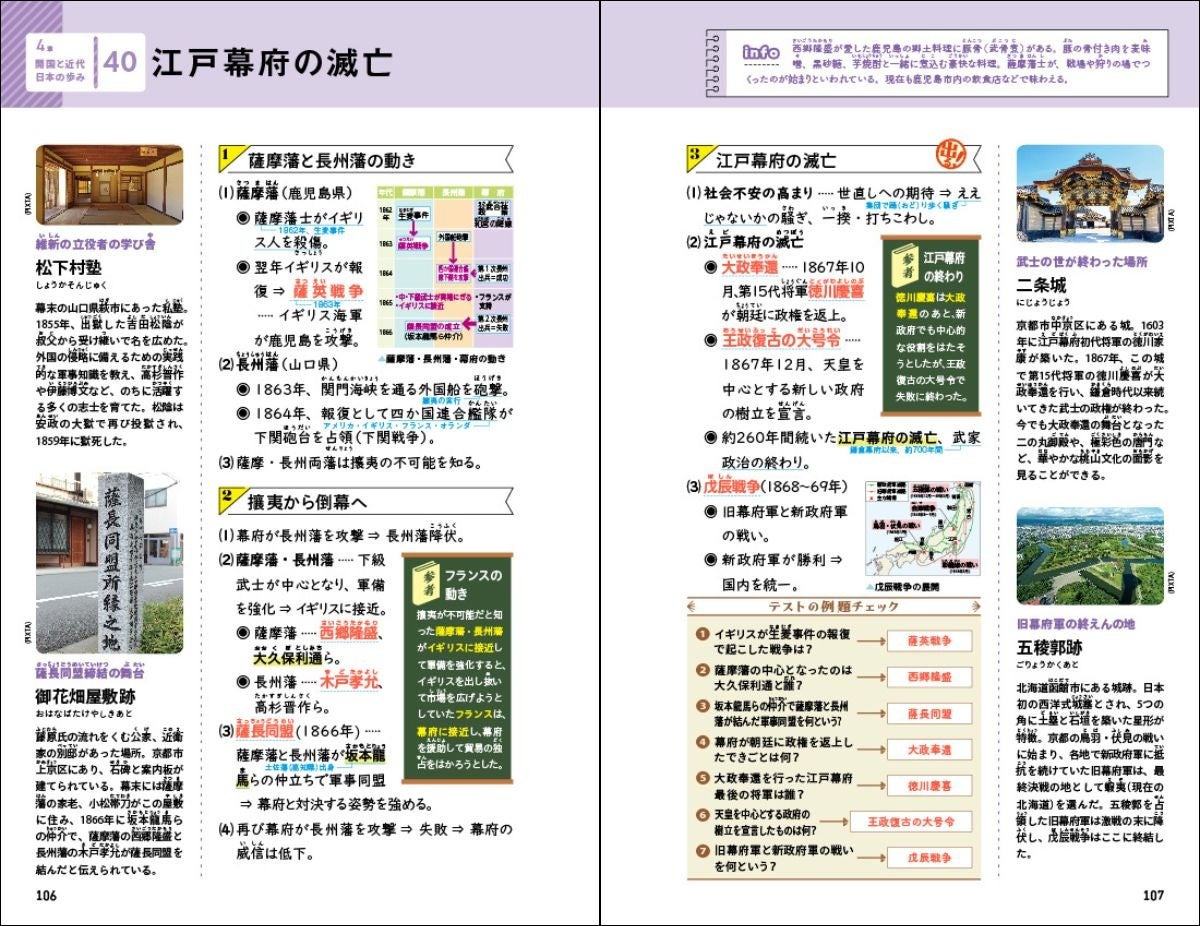 ページの左右には、学習内容に関連した観光情報が載っており、楽しみながら地理や歴史を学べるので、知識がより記憶に定着しやすくなります。