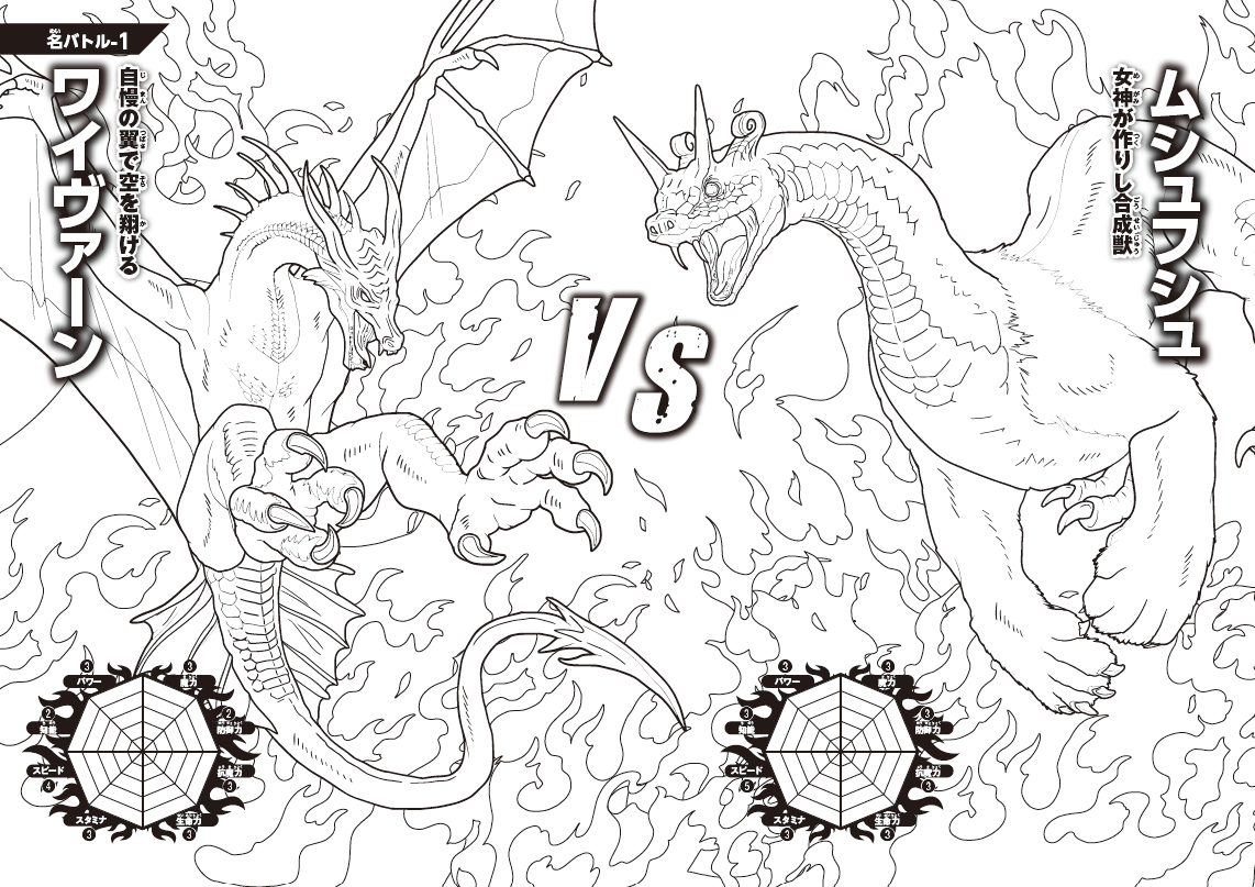 ①ドラゴン最強王図鑑 ぬりえ 名バトル1 ワイヴァーン VS ムシュフシュ