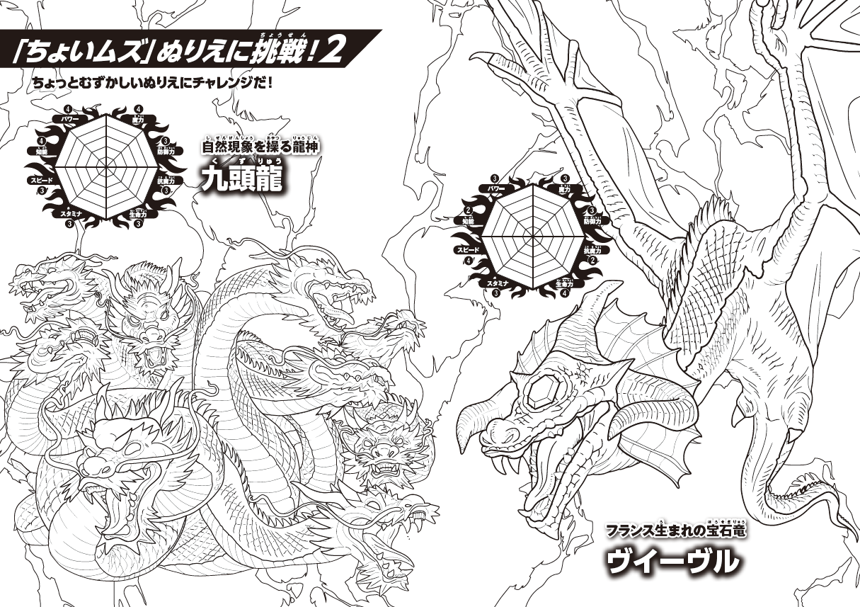 ⑪ドラゴン最強王図鑑 ぬりえ ちょいムズ メスター・ストゥアワーム VS ケツァルコアトル/九頭龍 VS ヴイーヴル
