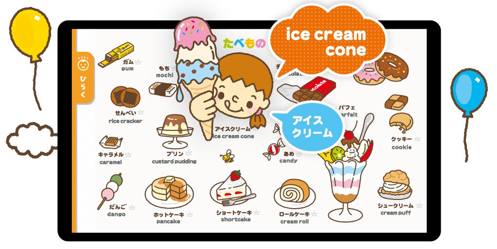 「きみのこえずかん」のほか、「はやあてクイズ」「パズルゲーム」「チャンツ」で楽しく英語に親しめます!