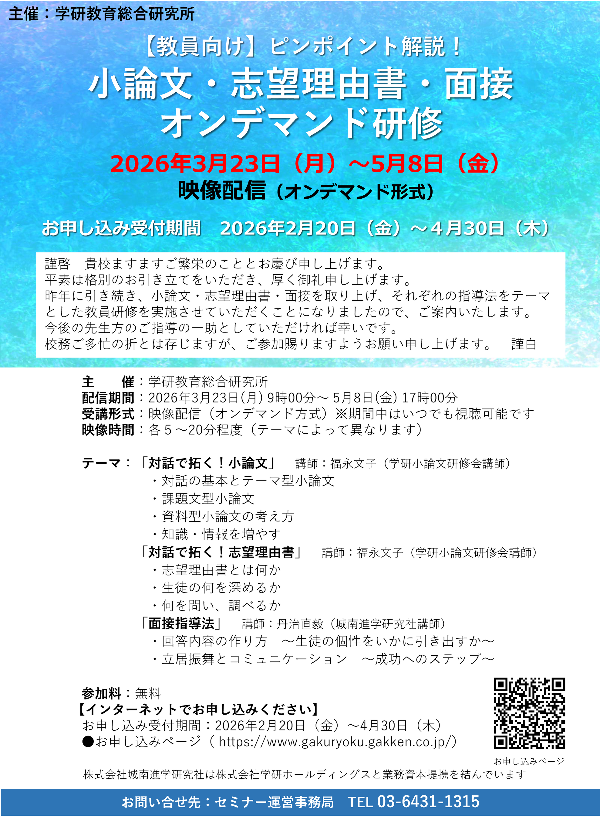 株式会社 学研ホールディングス(東京・品川/代表取締役社長:宮原博昭)のグループ会社、株式会社Gakken(東京・品川/代表取締役社長:南條達也)は、高等学校教員を対象とした「大学入試 小論文・志望理由書・面接 実践指導法オンデマンド研修会」を、2026年3月23日~5月8日の期間限定で、オンデマンド形式で配信中です。