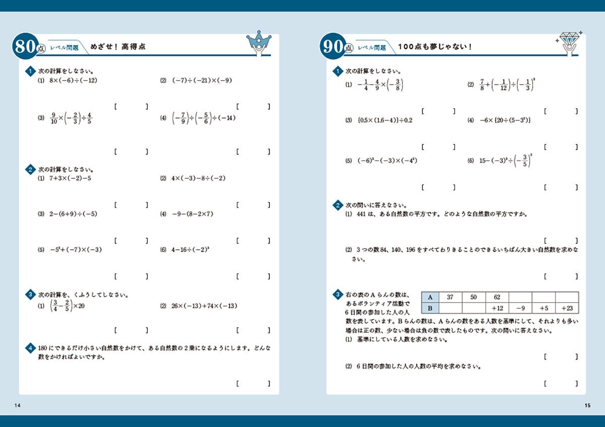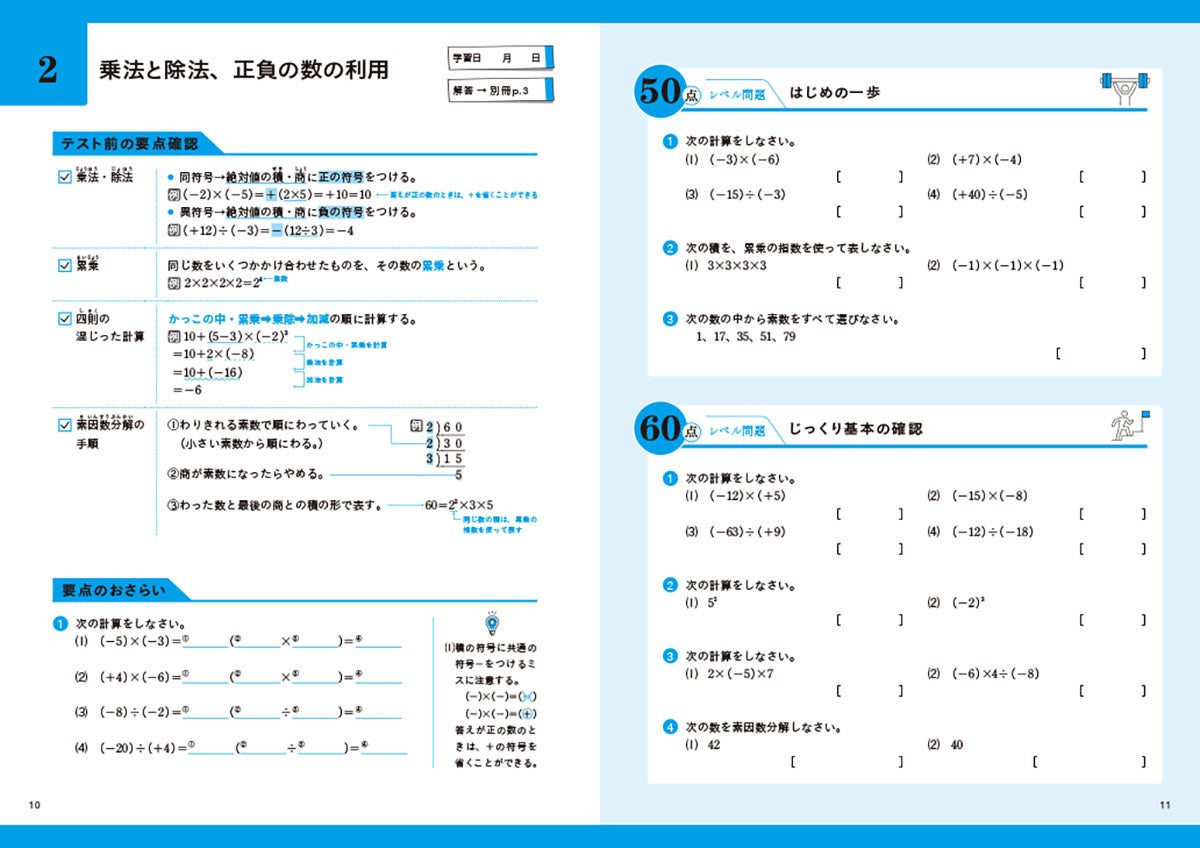 ▲「中1数学」より。「テスト前の要点確認」~「90点レベル問題」(※紙面はイメージです)
