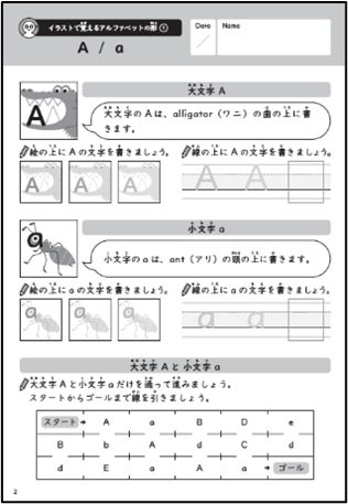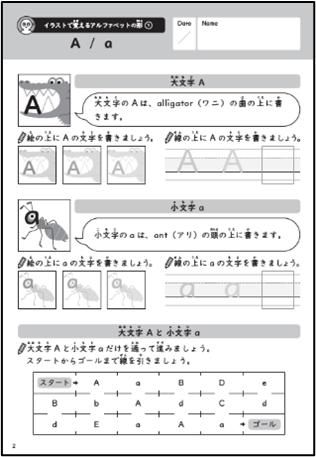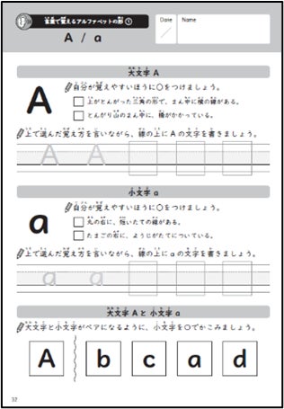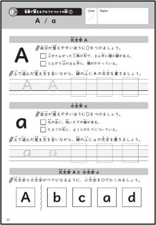 アセスメントの結果や、ワークシートを活用する中で、学習者の大文字・小文字の識別に不安があったり、書き間違えがよく見られたりする場合には、アルファベットの学習に最適なワークシートを準備。「アルファベット学習ワークシート」では、視覚優位の学習者に向けた「イラストで覚えるアルファベットの形」と、聴覚優位の学習者に向けた「言葉で覚えるアルファベットの形」を用意。英語学習の基礎となるアルファベットを、個々の認知特性に合わせた学習が可能です。