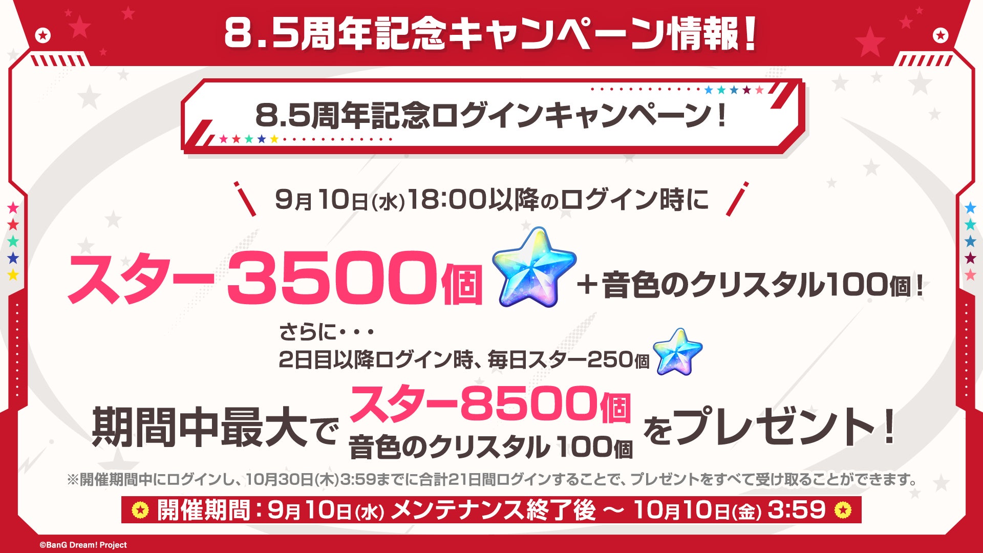 9月10日(水)のメンテナンス終了後より「8.5周年ログインキャンペーン!」を開催いたします。