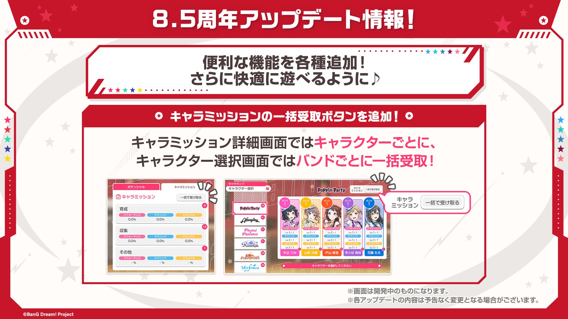 これまでは各キャラクターのキャラミッション詳細画面から受け取る形式でしたが、今後はバンドメンバー全員分をまとめて受け取ることができるようになります。