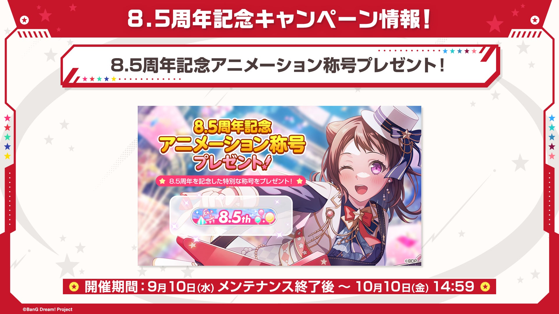 9月10日(水)メンテナンス終了後より「8.5周年記念アニメーション称号プレゼント!」を開催いたします。