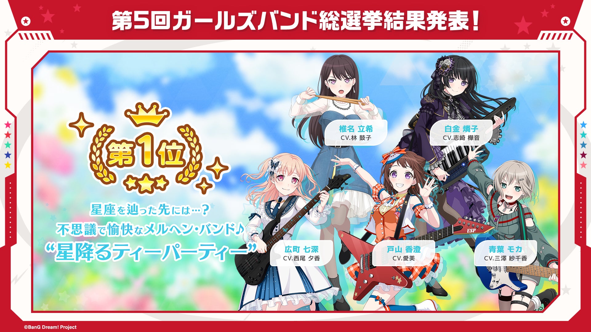 ガルパに登場するメンバー40人をシャッフルして結成した、童話をテーマとする8つのバンドのうち、1番聴きたいバンドを選ぶ総選挙です。