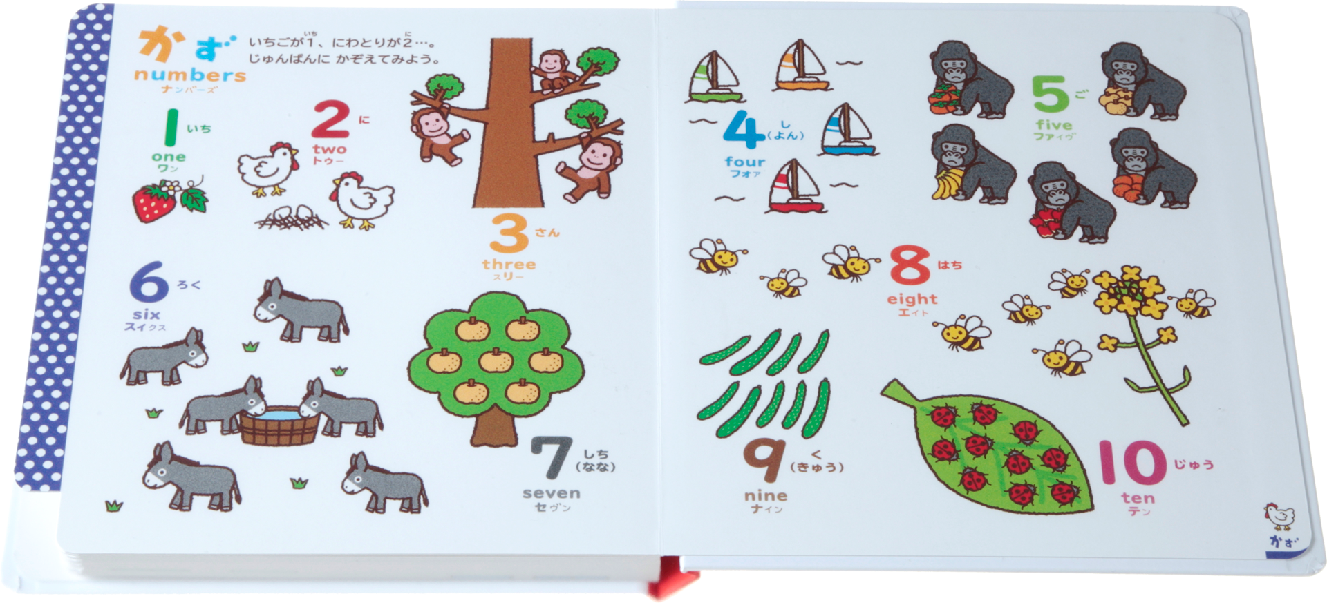 ▲「○○はどっち?」「かずはいくつ?」「むらさきはどれ?」など、楽しいクイズがいっぱい。こどもが興味を持ったら、各クイズに添えられた、おまけの質問もやってみて。