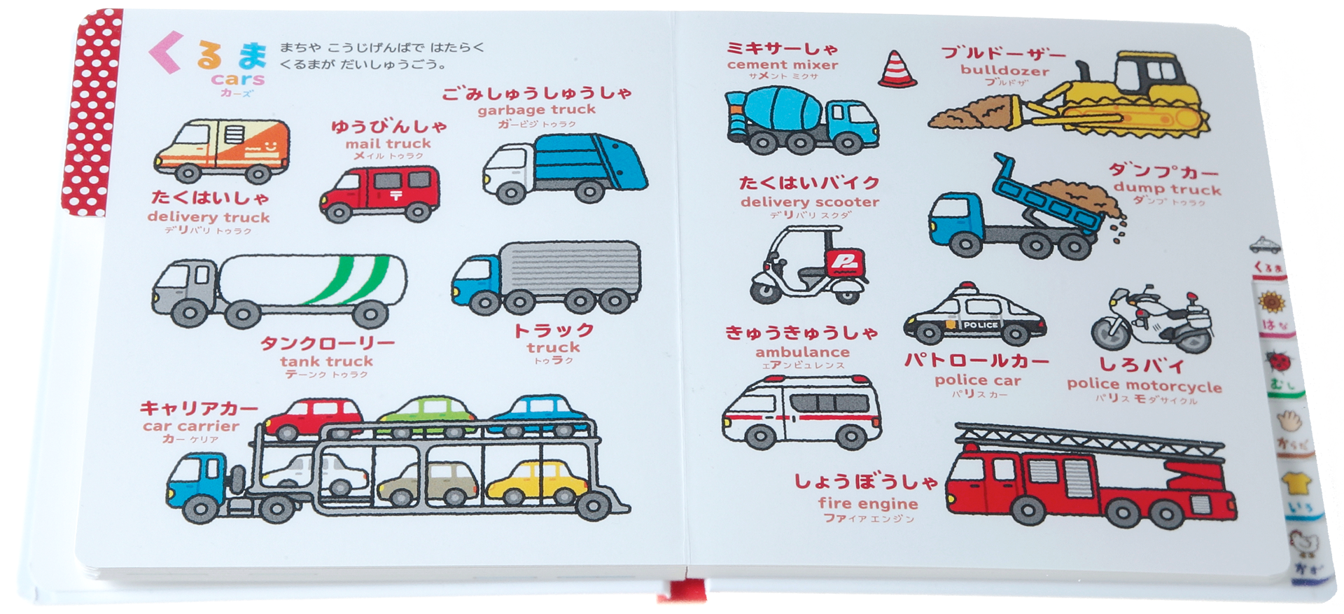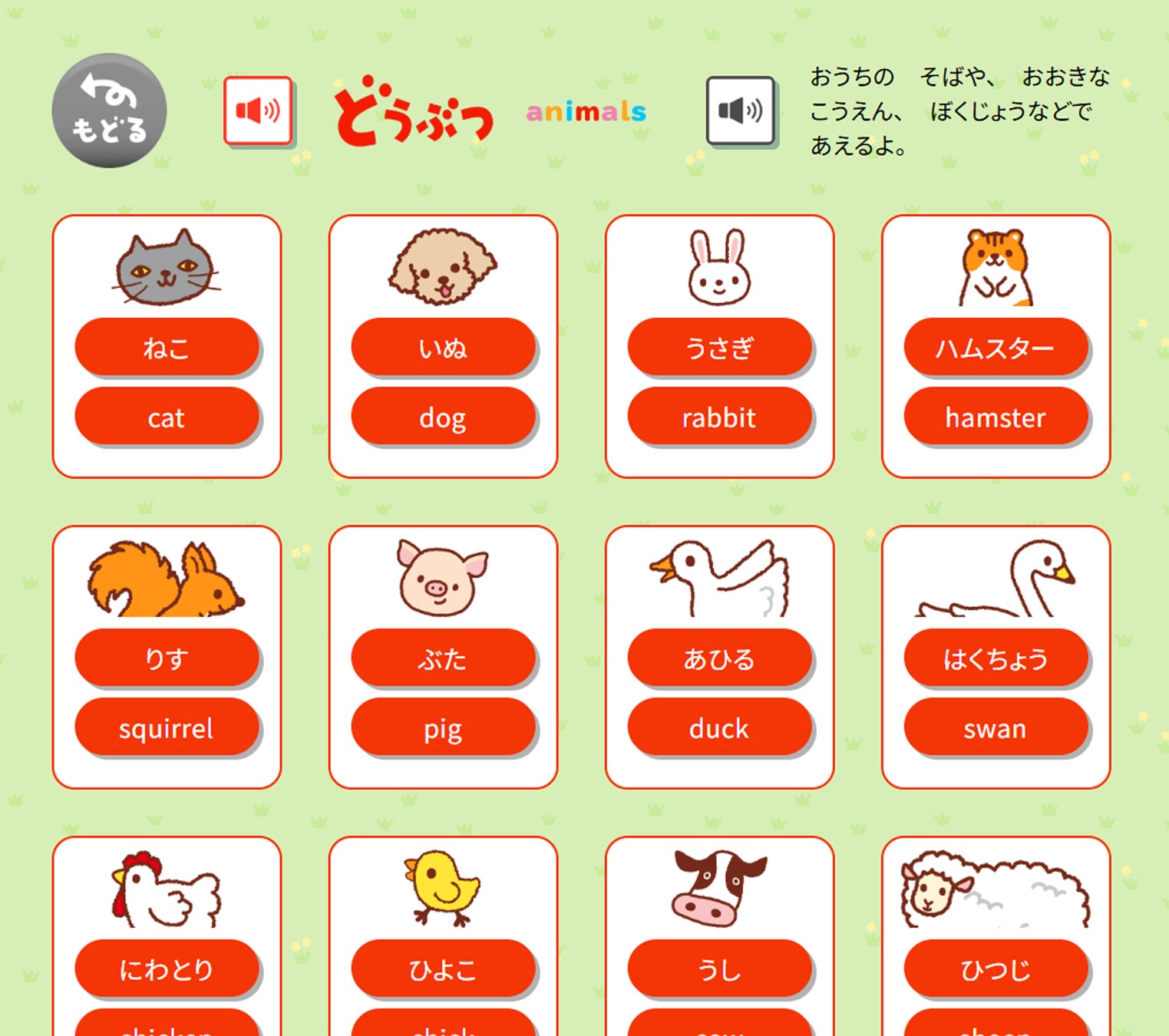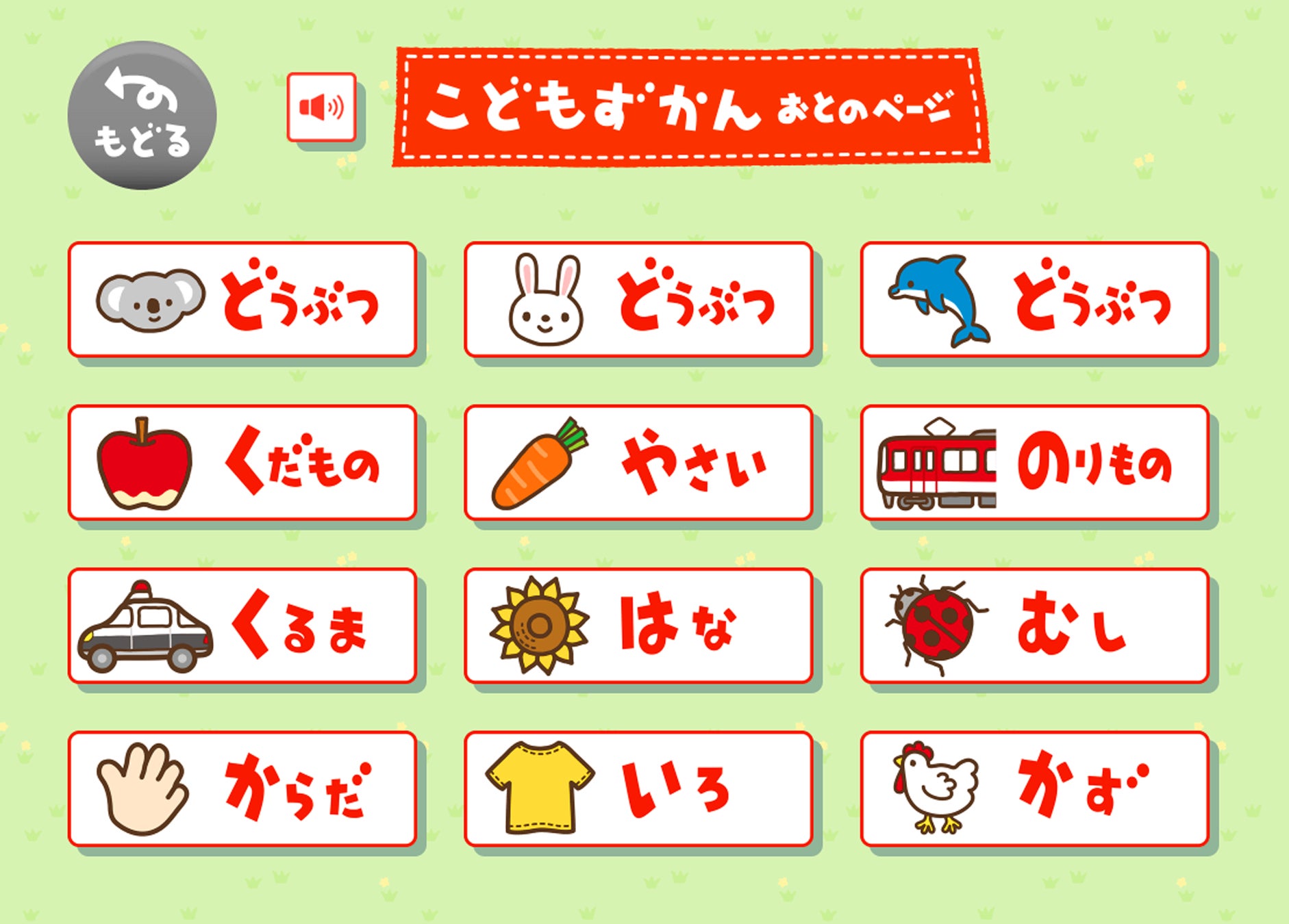 『0さい~4さい こどもずかん英語つき 改訂バージョン』に掲載された「どうぶつ」「くだもの」「やさい」「のりもの」「くるま」「はな・きのみ」「むし」「からだ」「いろ・かたち」「かず」の全テーマに対応し、日本語と英語両方の音声を、何度でも繰り返し確認することができます。