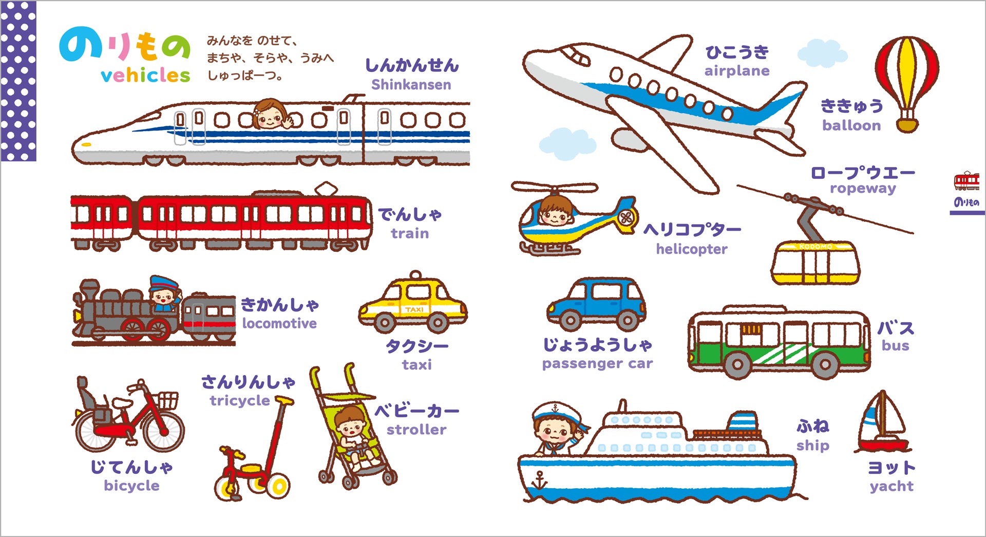 『0さい~4さい こどもずかん英語つき』は、動物、食べ物、乗り物など、こどもが興味を持ちやすいテーマごとに、絵と日本語・英語の言葉を掲載した人気絵本です。