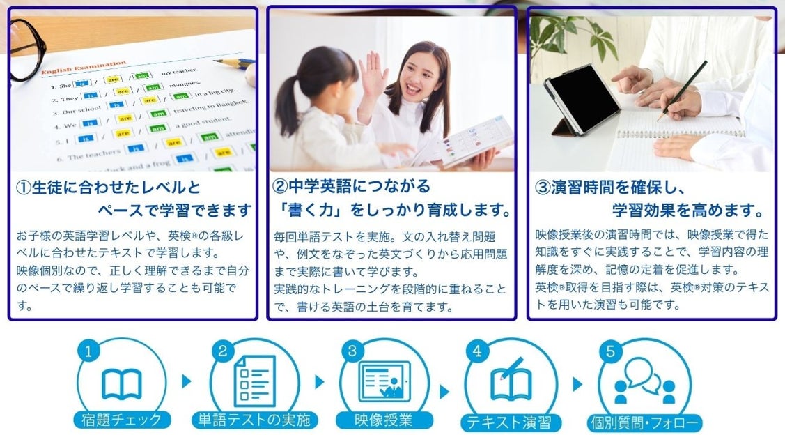 希望する児童は、映像授業後の演習時間で、確実な定着を図ります。また、英検Ⓡ取得を考えている児童は、その演習時間に英検Ⓡ対策のテキストを用いた演習も可能です。
