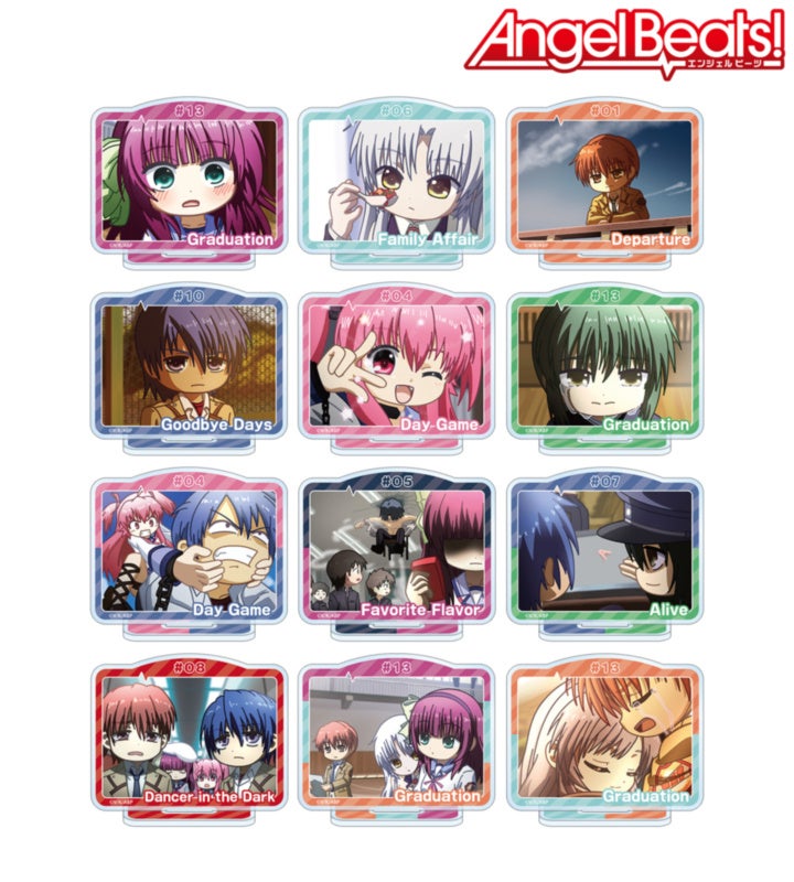 仲村ゆり、立華かなで、音無結弦、日向秀樹、ユイ、直井文人、高松の印象的なシーンをそのままデフォルメで再現し、アクリルスタンドに仕上げました。