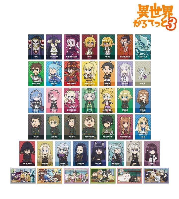 アインズ、アルべド、シャルティア、アウラ、マーレ、デミウルゴス、コキュートス、カズマ、アクア、めぐみん、ダクネス、スバル、エミリア、パック、レム、ラム、ベアトリス、オットー、ガーフィール、ターニャ、ヴィーシャ、ヴァイス、グランツ、ケーニッヒ、ノイマン、岩谷尚文、ラフタリア、フィーロ、シャドウ、アルファ、ベータ、ガンマ、デルタ、イプシロン、ゼータ、イータのイラスト、印象的なシーンをイラストカードに仕上げました。