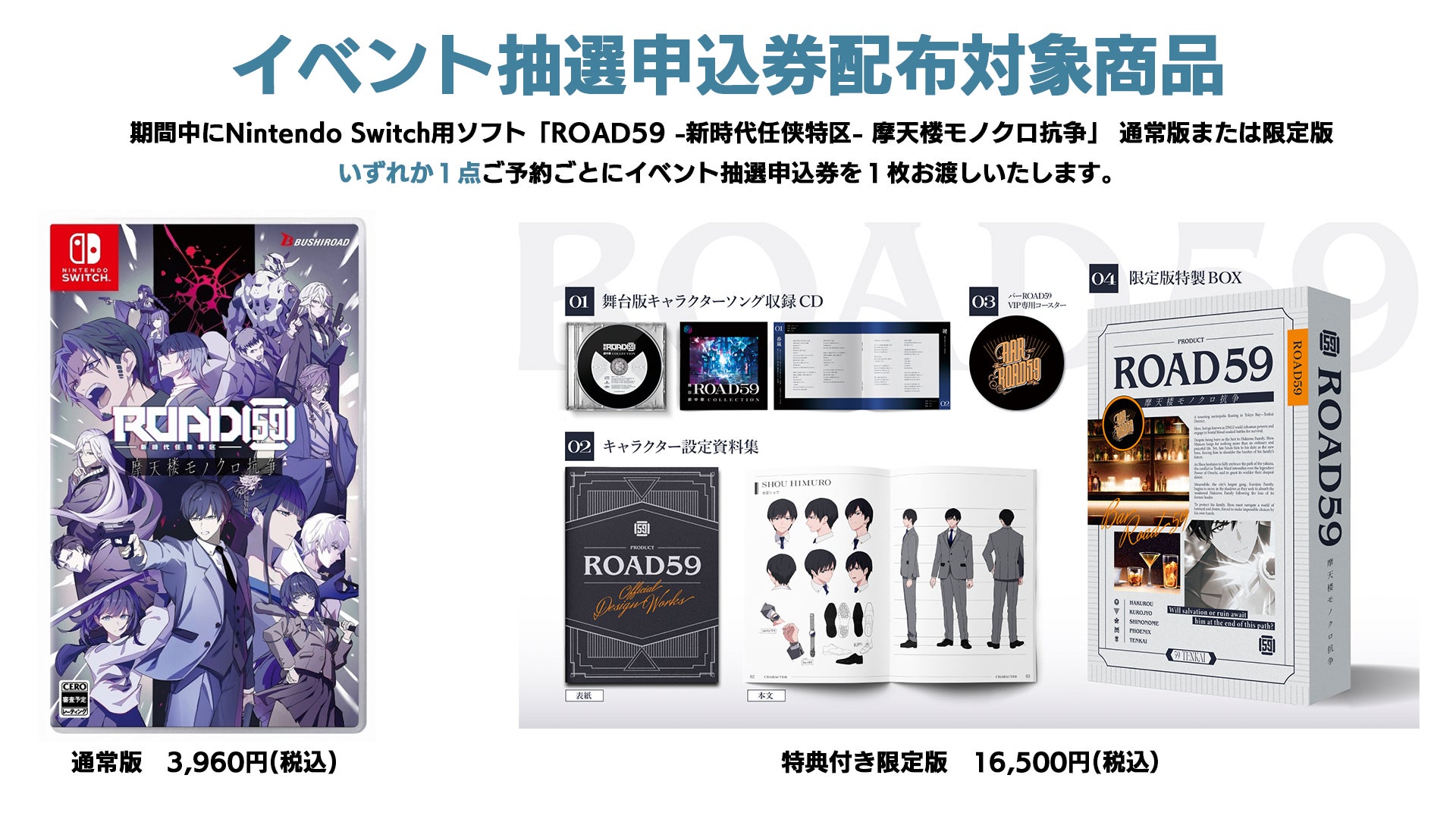 本イベントは、対象期間中にゲーマーズにてビジュアルノベルゲーム「ROAD59 -新時代任侠特区- 摩天楼モノクロ抗争」通常版もしくは限定版のどちらかをご予約いただいた方の中から抽選でご招待となります。