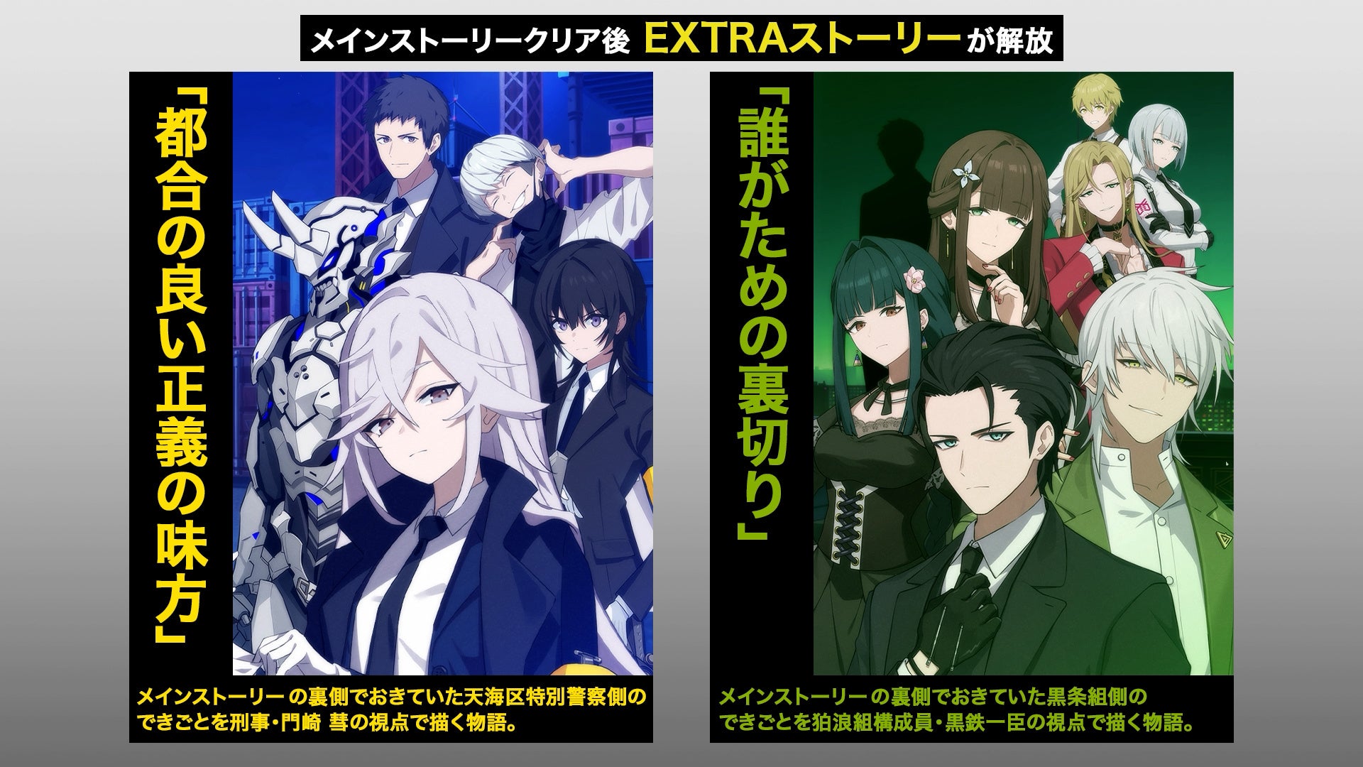 「EXTRAストーリー」では、それぞれ、天海区特別警察の刑事・門崎 彗と狛浪組の黒鉄一臣の視点から本編の裏側で起きていたストーリーを楽しむことができます。
