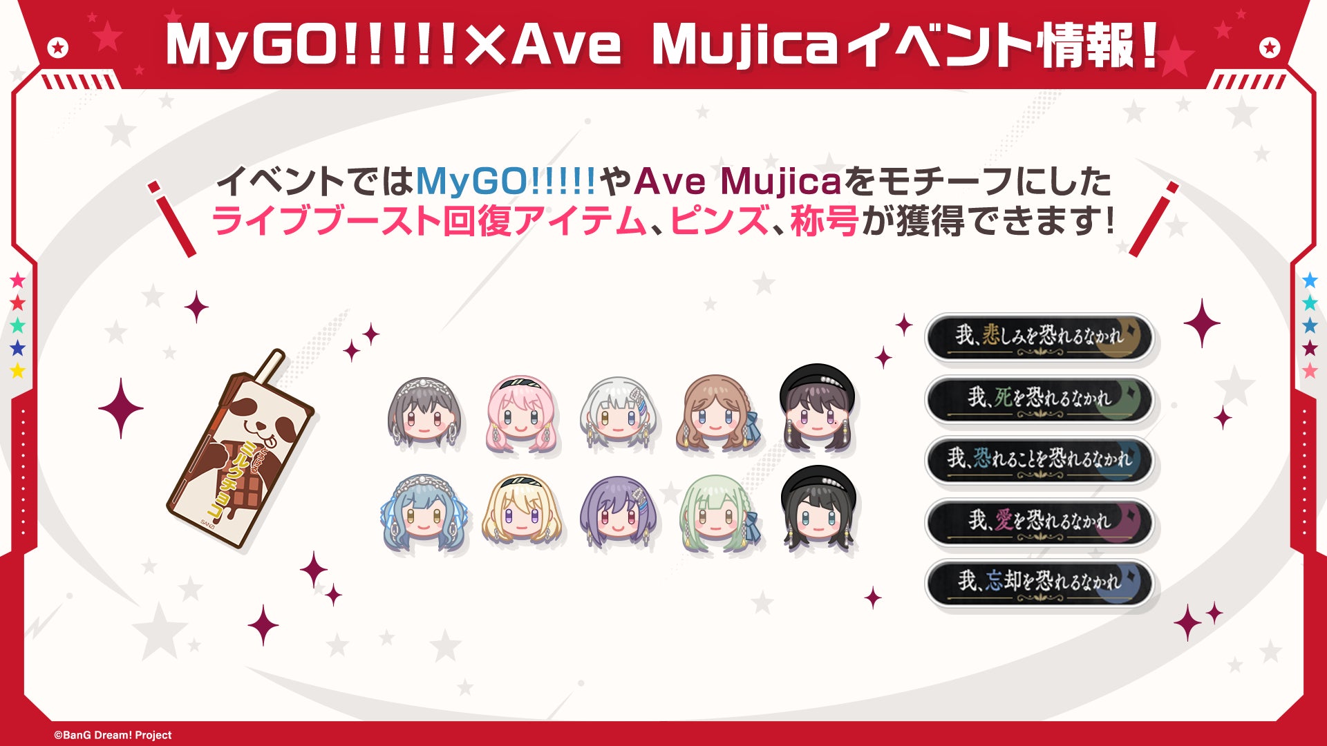 今回のイベントでは、イベント報酬としてMyGO!!!!!やAve Mujicaをモチーフとしたライブブースト回復アイテムやピンズ、称号などが登場いたします。
