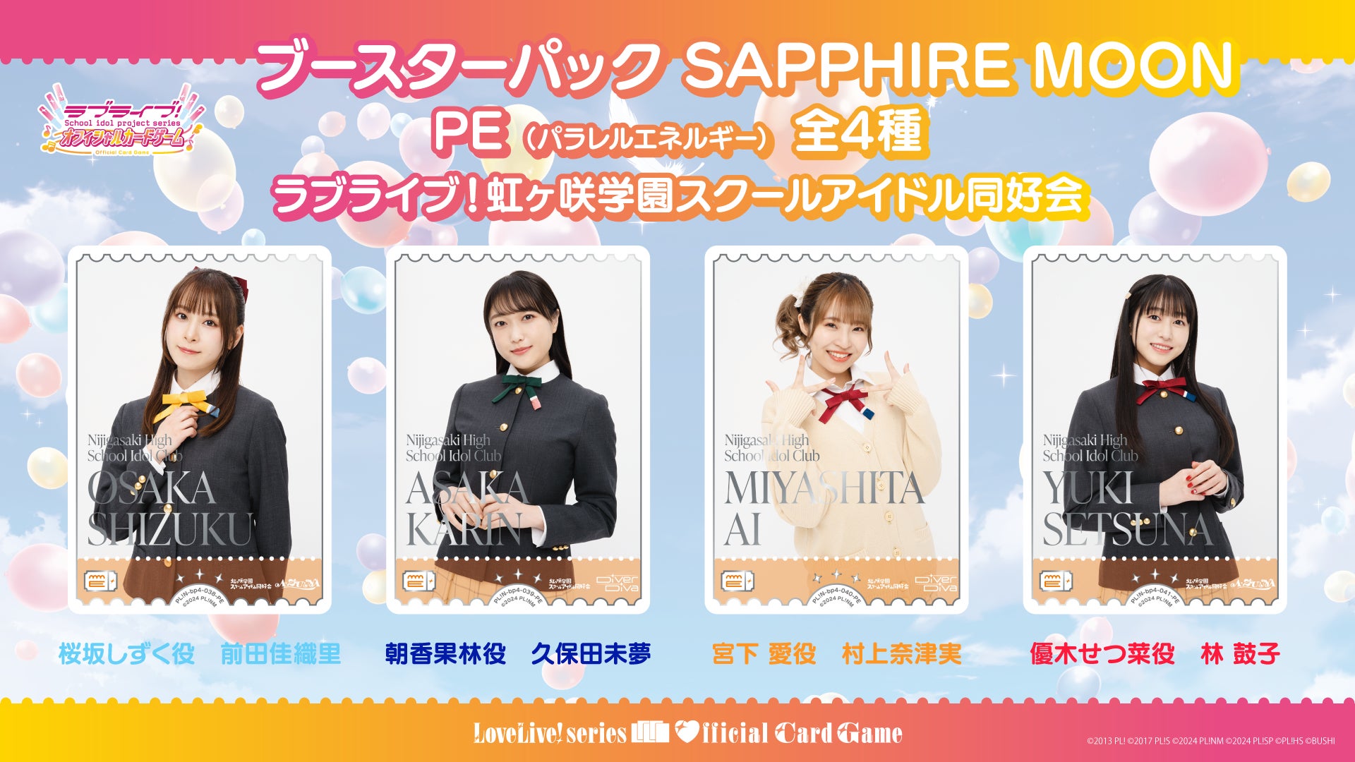 「ブースターパック SAPPHIRE MOON」には虹ヶ咲学園スクールアイドル同好会 桜坂しずく役 前田佳織里、朝香果林役 久保田未夢、宮下 愛役 村上奈津実、優木せつ菜役 林 鼓子の写真を使用したカードが収録されます!