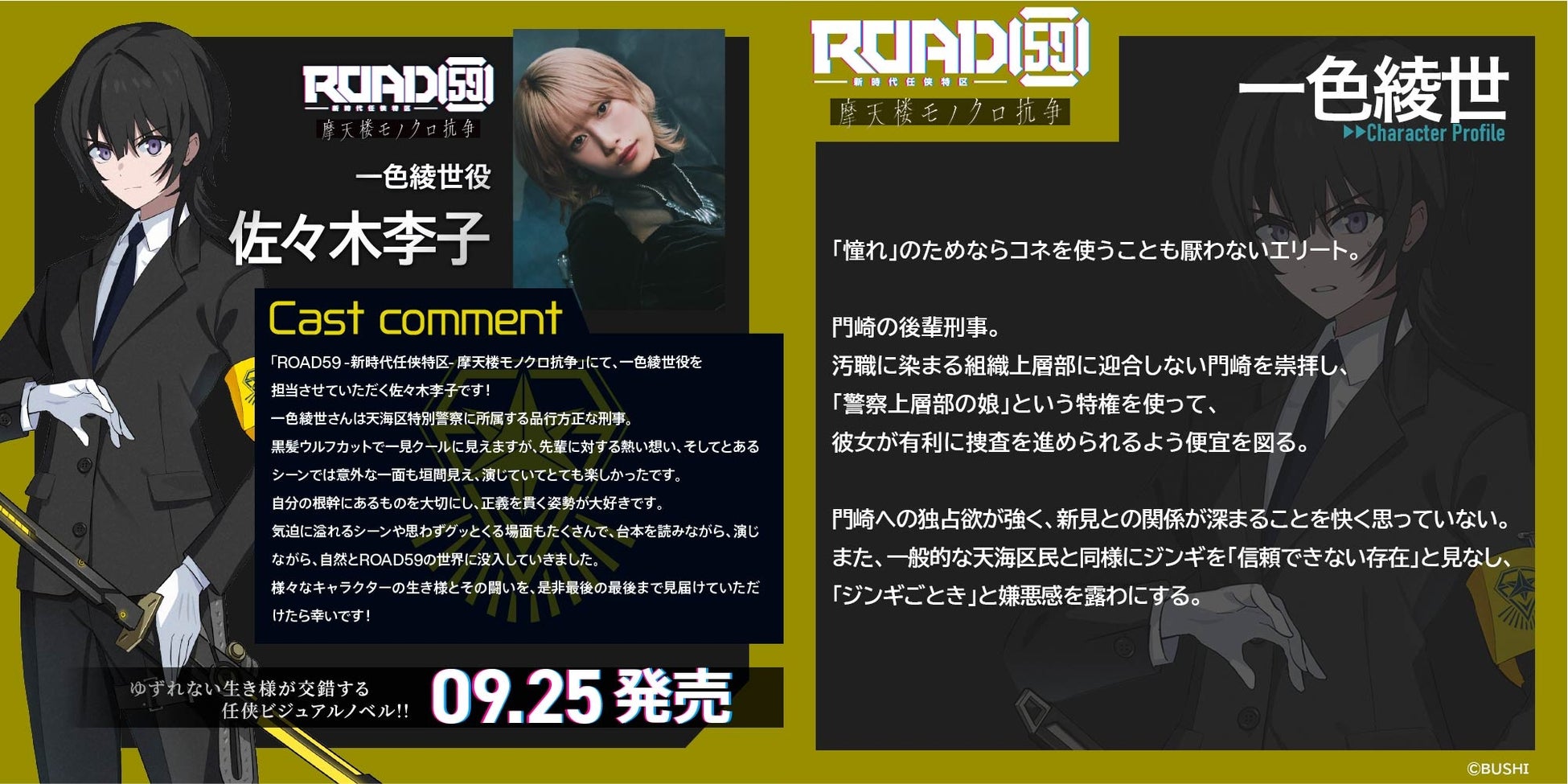 『ROAD59 -新時代任侠特区- 摩天楼モノクロ抗争』にて、一色綾世役を担当させていただく佐々木李子です!