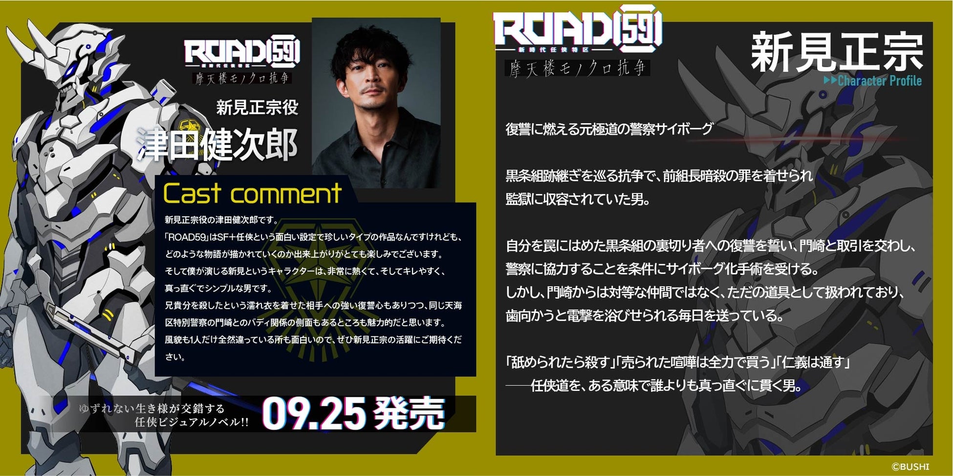 新見正宗役の津田健次郎です。『ROAD59』はSF+任侠という面白い設定で珍しいタイプの作品なんですけれども、どのような物語が描かれていくのか出来上がりがとても楽しみでございます。