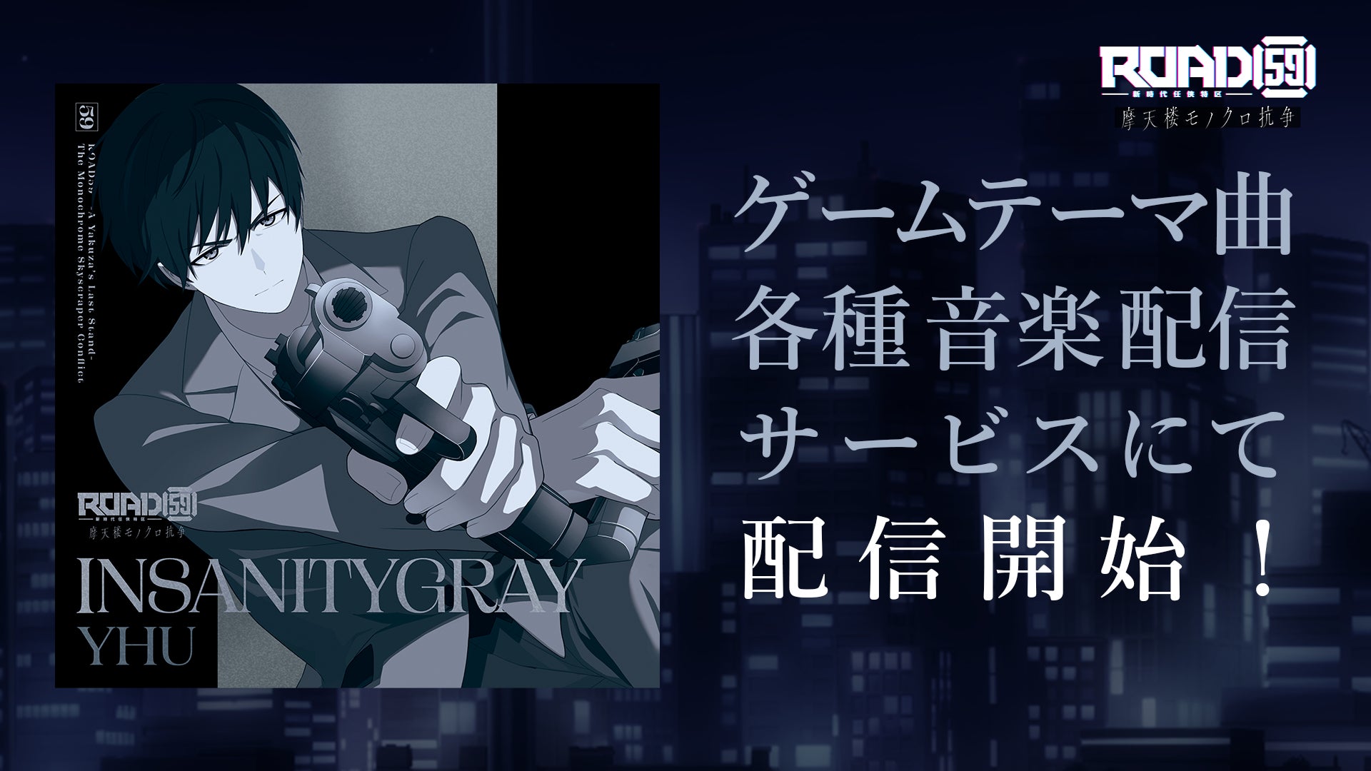 10月2日0時より各種音楽配信サービスにてビジュアルノベルゲーム「ROAD59 -新時代任侠特区- 摩天楼モノクロ抗争」のメインテーマ曲「INSANITYGRAY」をデジタルリリースいたしました。